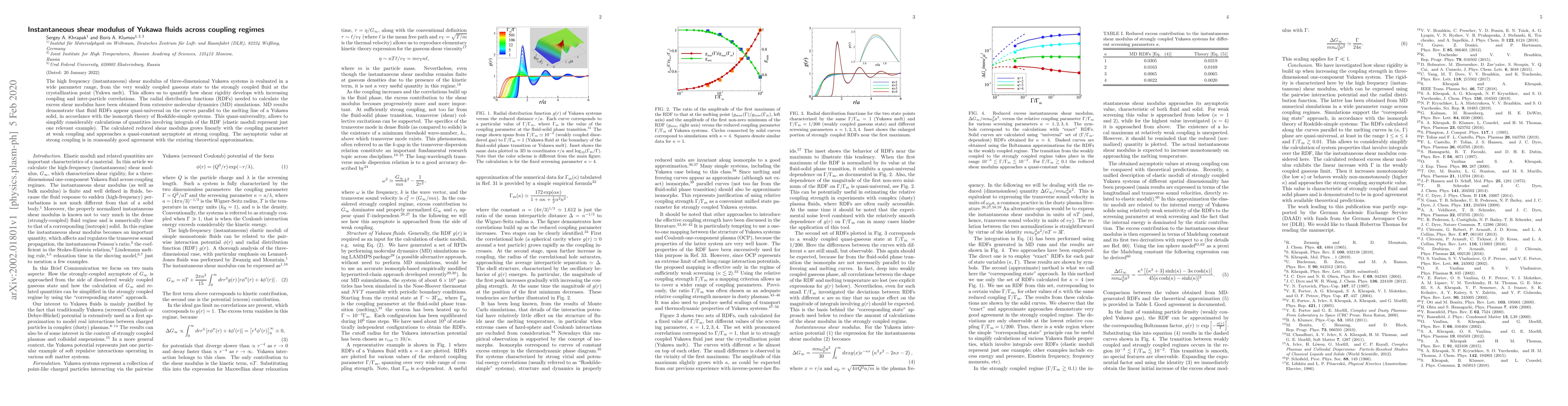 This paper evaluates the instantaneous shear modulus of three-dimensional Yukawa systems across various coupling regimes, revealing a linear growth with coupling at weak coupling and approaching a quasi-constant value at strong coupling. Molecular dynamics simulations support the quasi-universality of fluid radial distribution functions, simplifying calculations of elastic moduli.