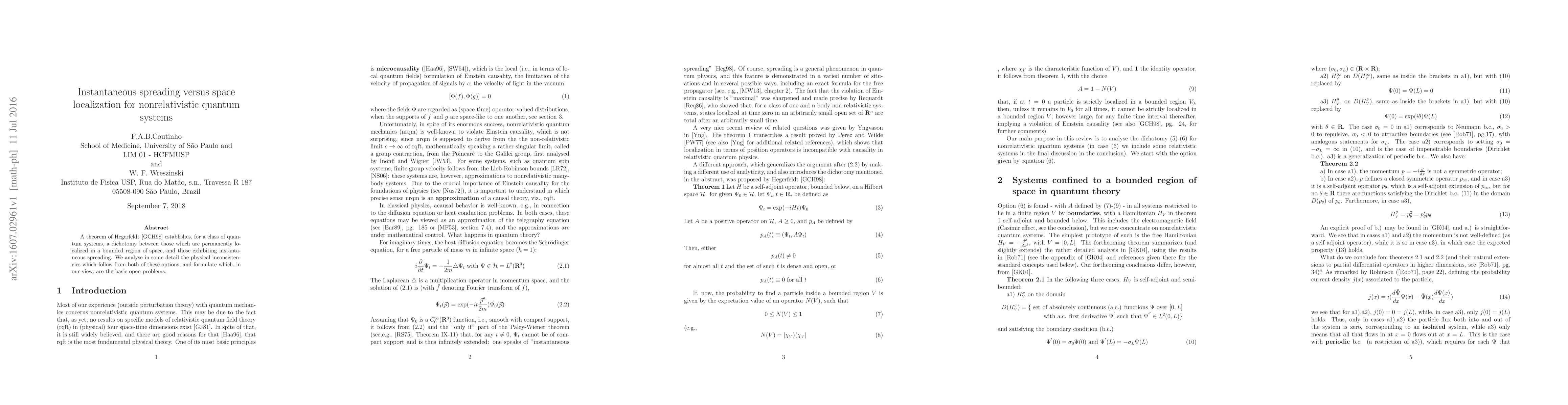 A theorem of Hegerfeldt (Instantaneous spreading and Einstein causality in quantum theory, Ann. Phys. Leipzig vol. 7, 716-725 (1998)) establishes, for a class of quantum systems, a dichotomy between those which are permanently localized in a bounded region of space, and those exhibiting instantaneous spreading. We analyse in some detail the physical inconsistencies which follow from both of these options, and formulate which, in our view, are the basic open problems.