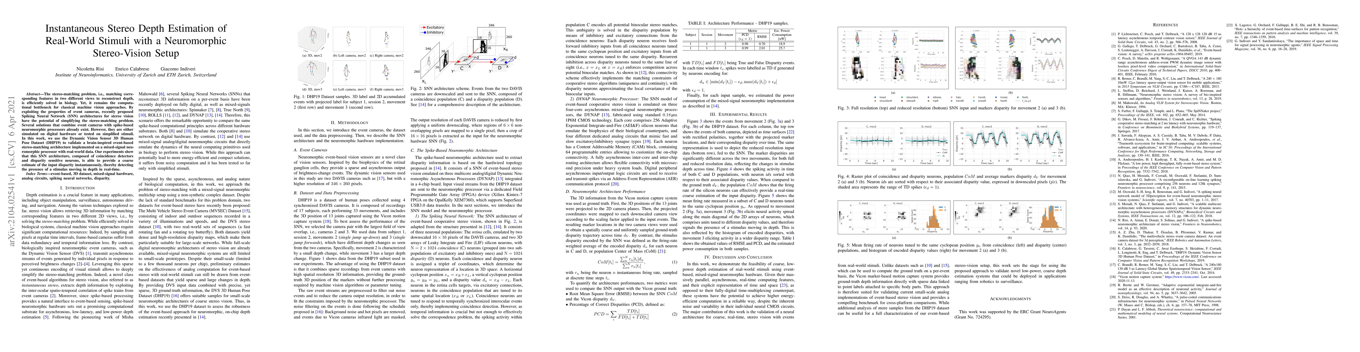 This paper proposes a brain-inspired Spiking Neural Network (SNN) architecture for instantaneous stereo depth estimation using event cameras on a neuromorphic processor. The approach demonstrates real-time depth detection with the Dynamic Vision Sensor 3D Human Pose Dataset (DHP19), showcasing its effectiveness in real-world scenarios.
