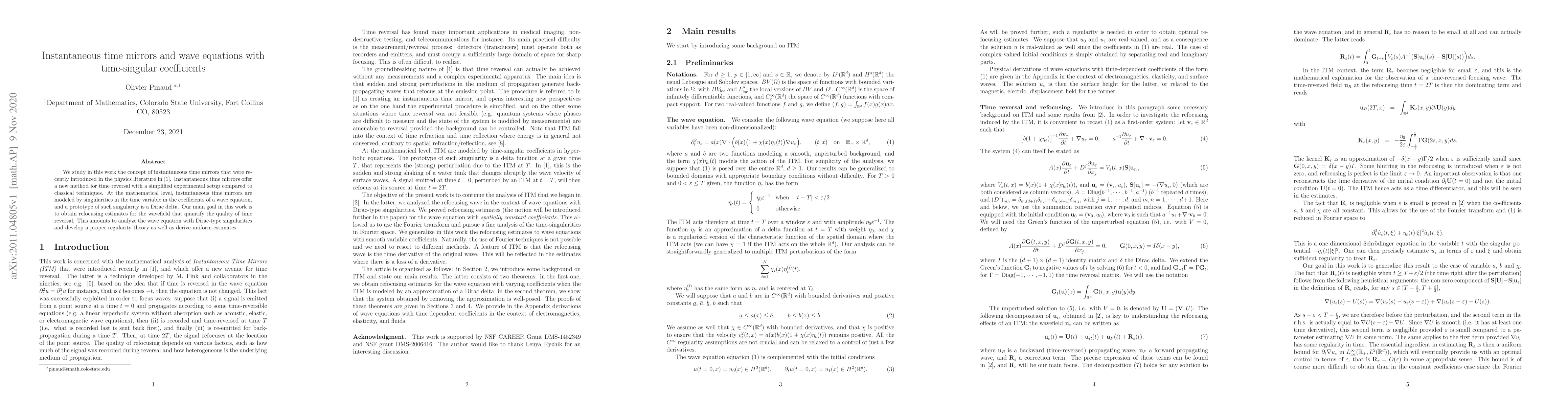 This paper investigates instantaneous time mirrors, a novel time reversal method using simplified experimental setups, modeled mathematically by singularities in wave equation coefficients. The authors aim to derive refocusing estimates for the wavefield, focusing on analyzing the wave equation with Dirac-type singularities and developing a regularity theory.
