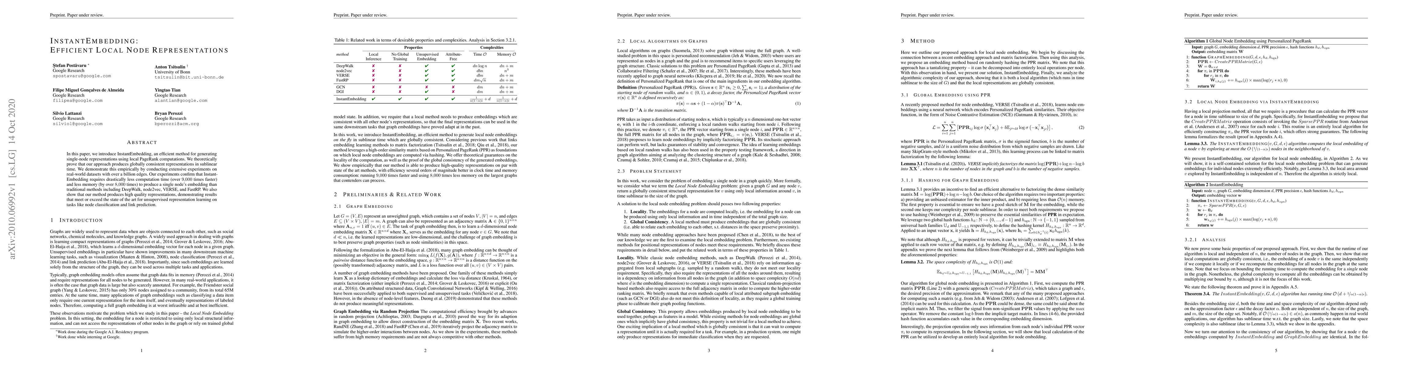 InstantEmbedding efficiently generates single-node representations using local PageRank computations, achieving globally consistent results in sublinear time. Experiments show it is over 9,000 times faster and 8,000 times more memory-efficient than traditional methods, while maintaining high-quality performance for node classification and link prediction.