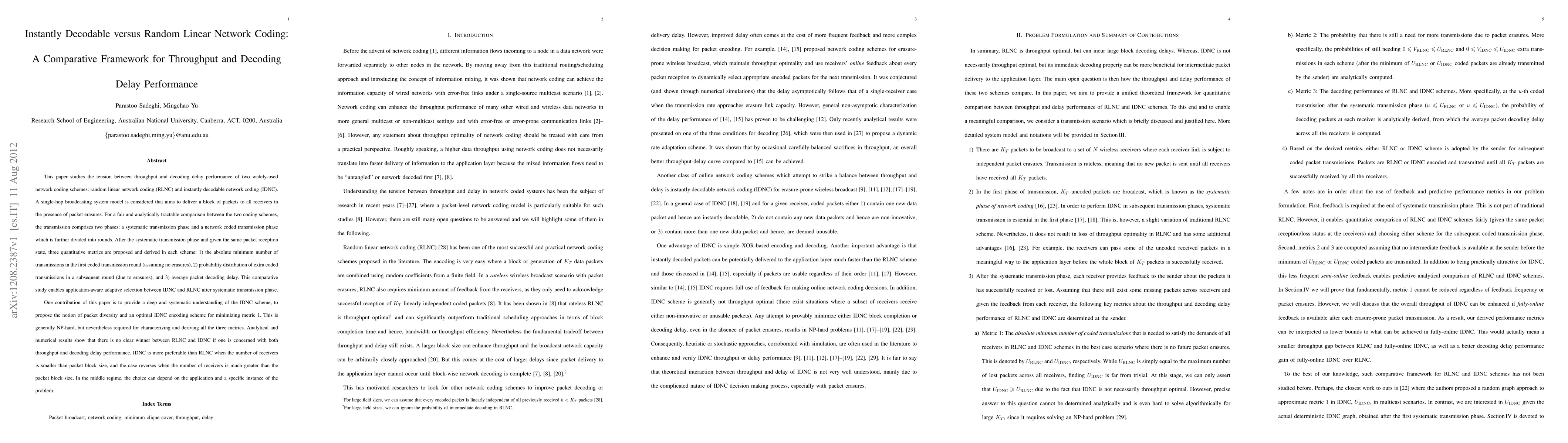 This paper studies the tension between throughput and decoding delay performance of two widely-used network coding schemes: random linear network coding (RLNC) and instantly decodable network coding (IDNC). A single-hop broadcasting system model is considered that aims to deliver a block of packets to all receivers in the presence of packet erasures. For a fair and analytically tractable comparison between the two coding schemes, the transmission comprises two phases: a systematic transmission phase and a network coded transmission phase which is further divided into rounds. After the systematic transmission phase and given the same packet reception state, three quantitative metrics are proposed and derived in each scheme: 1) the absolute minimum number of transmissions in the first coded transmission round (assuming no erasures), 2) probability distribution of extra coded transmissions in a subsequent round (due to erasures), and 3) average packet decoding delay. This comparative study enables application-aware adaptive selection between IDNC and RLNC after systematic transmission phase. One contribution of this paper is to provide a deep and systematic understanding of the IDNC scheme, to propose the notion of packet diversity and an optimal IDNC encoding scheme for minimizing metric 1. This is generally NP-hard, but nevertheless required for characterizing and deriving all the three metrics. Analytical and numerical results show that there is no clear winner between RLNC and IDNC if one is concerned with both throughput and decoding delay performance. IDNC is more preferable than RLNC when the number of receivers is smaller than packet block size, and the case reverses when the number of receivers is much greater than the packet block size. In the middle regime, the choice can depend on the application and a specific instance of the problem.