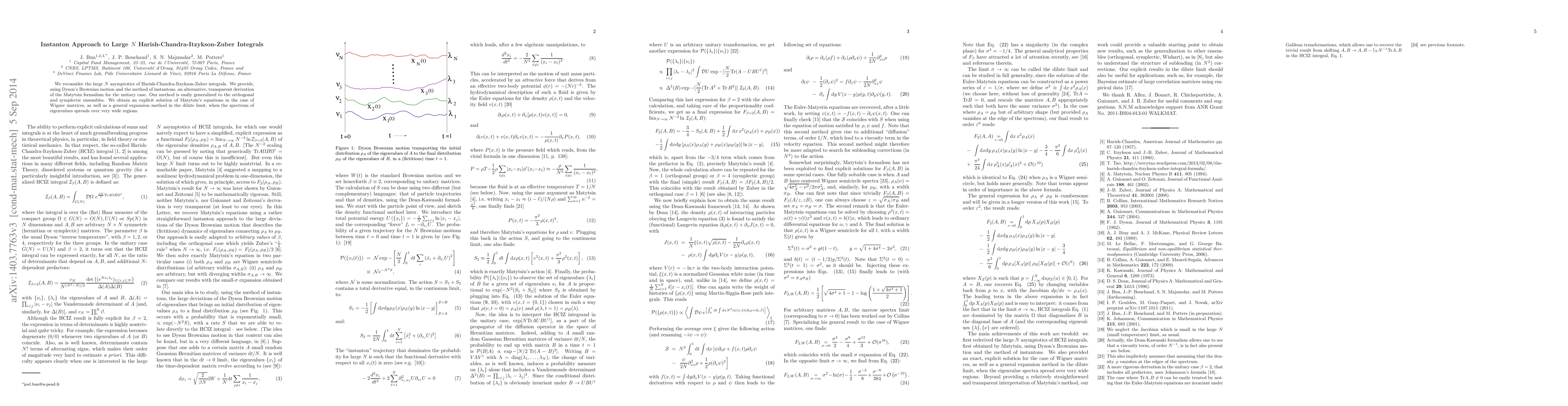 This paper offers a new instanton-based approach to deriving the large $N$ asymptotics of Harish-Chandra-Itzykson-Zuber integrals, providing a transparent method for the unitary case and extending it to orthogonal and symplectic ensembles, including explicit solutions for Wigner matrices and a general expansion method for dilute limits.