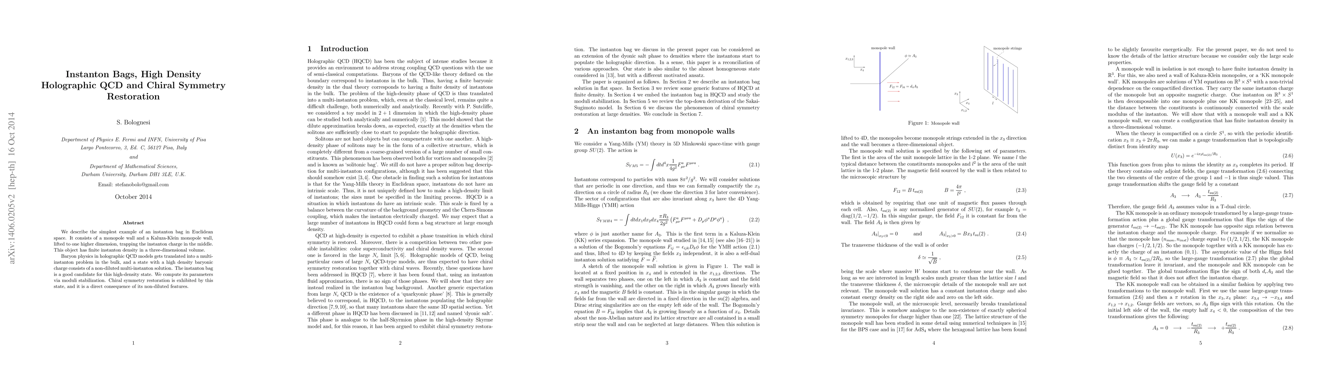 We describe the simplest example of an instanton bag in Euclidean space. It consists of a monopole wall and a Kaluza-Klein monopole wall, lifted to one higher dimension, trapping the instanton charge in the middle. This object has finite instanton density in a three-dimensional volume. Baryon physics in holographic QCD models gets translated into a multi-instanton problem in the bulk, and a state with a high density baryonic charge consists of a non-diluted multi-instanton solution. The instanton bag is a good candidate for this high-density state. We compute its parameters via moduli stabilization. Chiral symmetry restoration is exhibited by this state, and it is a direct consequence of its non-diluted features.