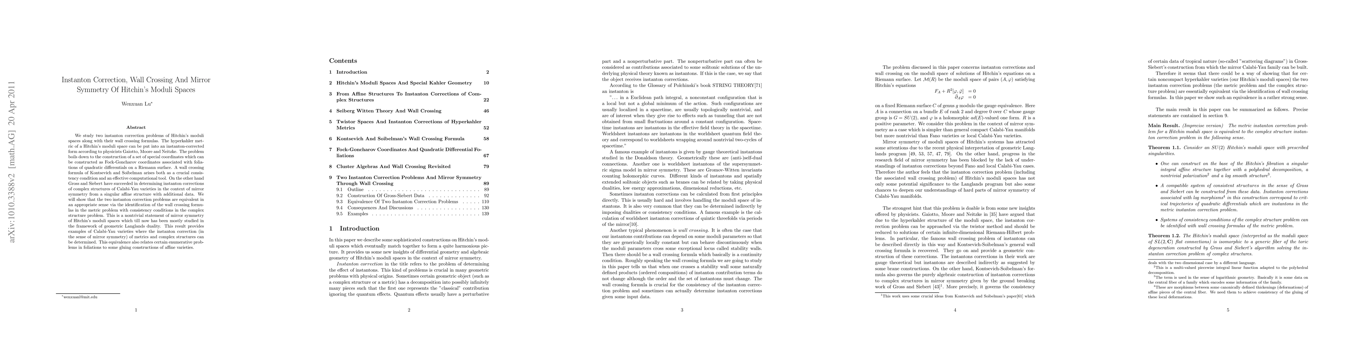 We study two instanton correction problems of Hitchin's moduli spaces along with their wall crossing formulas. The hyperkahler metric of a Hitchin's moduli space can be put into an instanton-corrected form according to physicists Gaiotto, Moore and Neitzke. The problem boils down to the construction of a set of special coordinates which can be constructed as Fock-Goncharov coordinates associated with foliations of quadratic differentials on a Riemann surface. A wall crossing formula of Kontsevich and Soibelman arises both as a crucial consistency condition and an effective computational tool. On the other hand Gross and Siebert have succeeded in determining instanton corrections of complex structures of Calabi-Yau varieties in the context of mirror symmetry from a singular affine structure with additional data. We will show that the two instanton correction problems are equivalent in an appropriate sense via the identification of the wall crossing formulas in the metric problem with consistency conditions in the complex structure problem. This result provides examples of Calabi-Yau varieties where the instanton correction (in the sense of mirror symmetry) of metrics and complex structures can be determined.