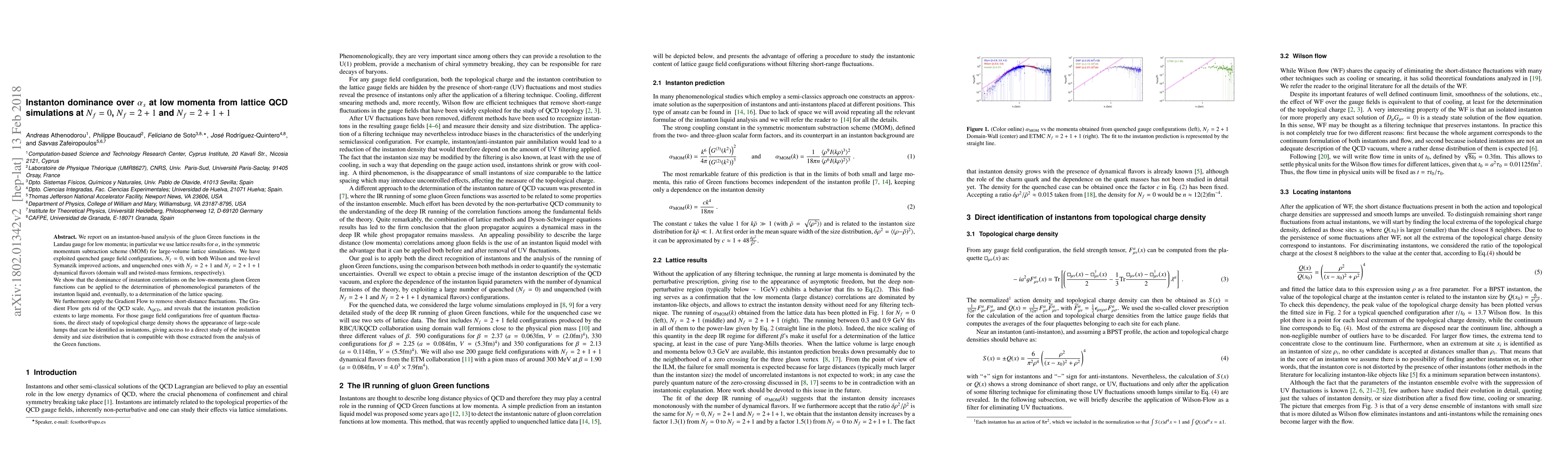 We report on an instanton-based analysis of the gluon Green functions in the Landau gauge for low momenta; in particular we use lattice results for $\alpha_s$ in the symmetric momentum subtraction scheme (${\rm MOM}$) for large-volume lattice simulations. We have exploited quenched gauge field configurations, $N_f=0$, with both Wilson and tree-level Symanzik improved actions, and unquenched ones with $N_f=2+1$ and $N_f=2+1+1$ dynamical flavors (domain wall and twisted-mass fermions, respectively). We show that the dominance of instanton correlations on the low-momenta gluon Green functions can be applied to the determination of phenomenological parameters of the instanton liquid and, eventually, to a determination of the lattice spacing. We furthermore apply the Gradient Flow to remove short-distance fluctuations. The Gradient Flow gets rid of the QCD scale, $\Lambda_{\rm QCD}$, and reveals that the instanton prediction extents to large momenta. For those gauge field configurations free of quantum fluctuations, the direct study of topological charge density shows the appearance of large-scale lumps that can be identified as instantons, giving access to a direct study of the instanton density and size distribution that is compatible with those extracted from the analysis of the Green functions.
