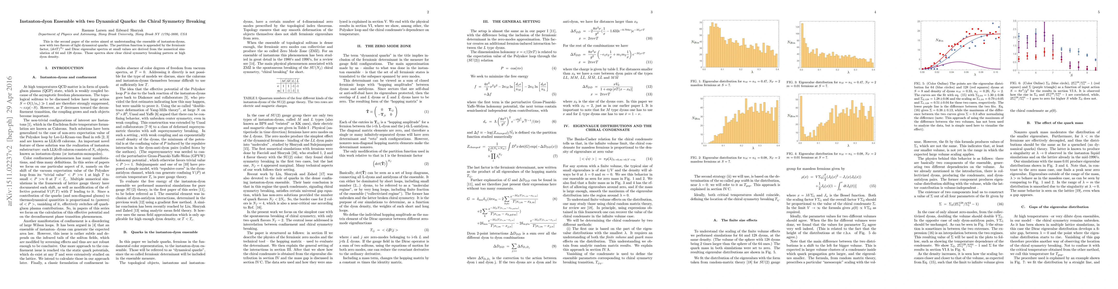 This paper investigates the ensemble of instanton-dyons with two dynamical quark flavors, revealing chiral symmetry breaking through numerical simulations of dyons and their Dirac eigenvalue spectra, particularly at high dyon densities.