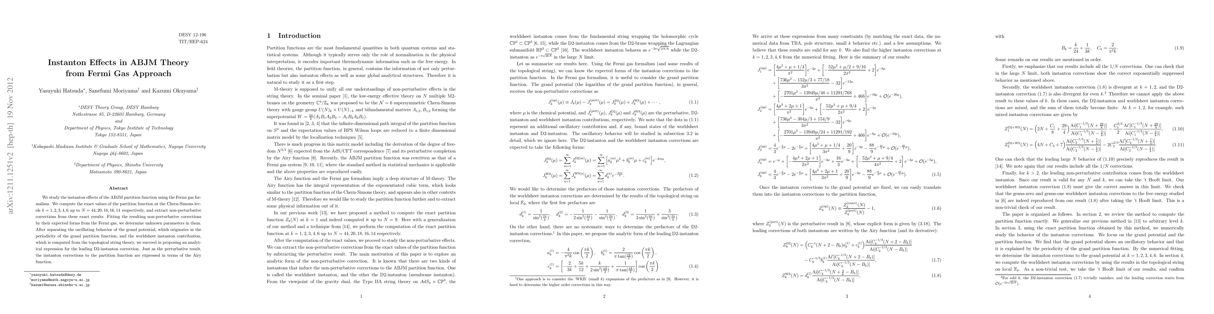 This paper investigates instanton effects in the ABJM theory through the Fermi gas approach, determining exact partition function values at specific Chern-Simons levels and extracting non-perturbative corrections. An analytical expression for the leading D2-instanton correction is proposed, expressed using the Airy function, akin to perturbative results.