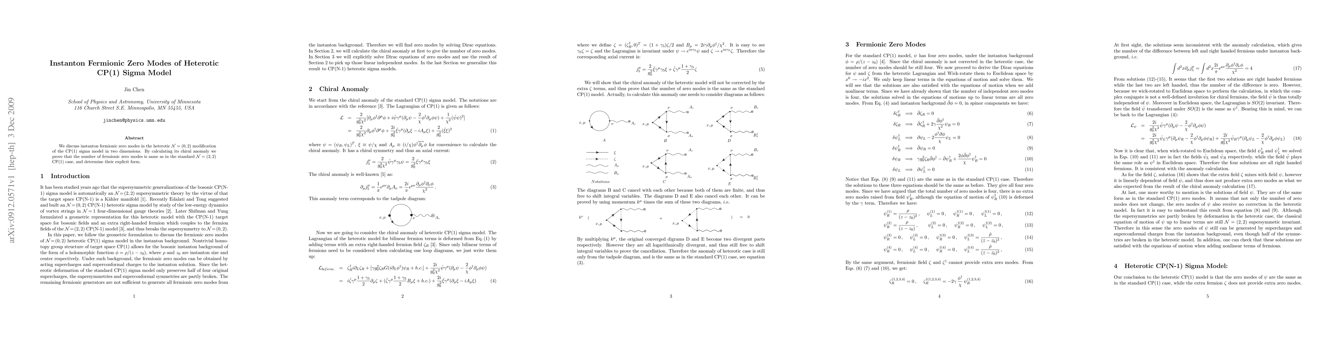 We discuss instanton fermionic zero modes in the heterotic N=(0,2) modification of the CP(1) sigma model in two dimensions. By calculating its chiral anomaly we prove that the number of fermionic zero modes is same as in the standard N=(2,2) CP(1) case, and determine their explicit form.