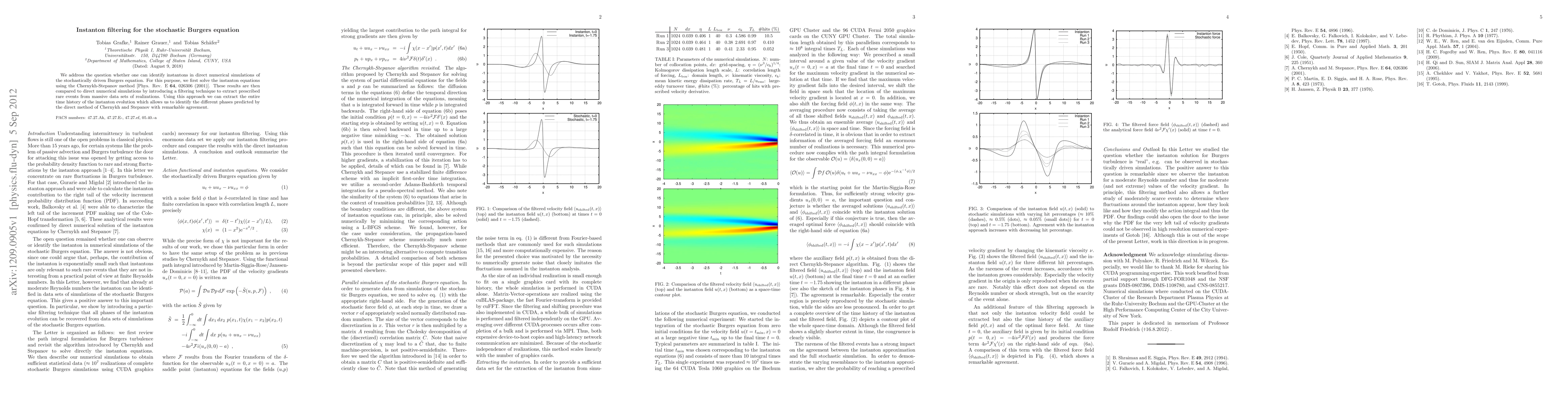 This paper explores the identification of instantons in the stochastic Burgers equation through direct numerical simulations, using the Chernykh-Stepanov method to solve instanton equations and a filtering technique to extract rare events from simulation data, achieving good agreement with theoretical predictions.
