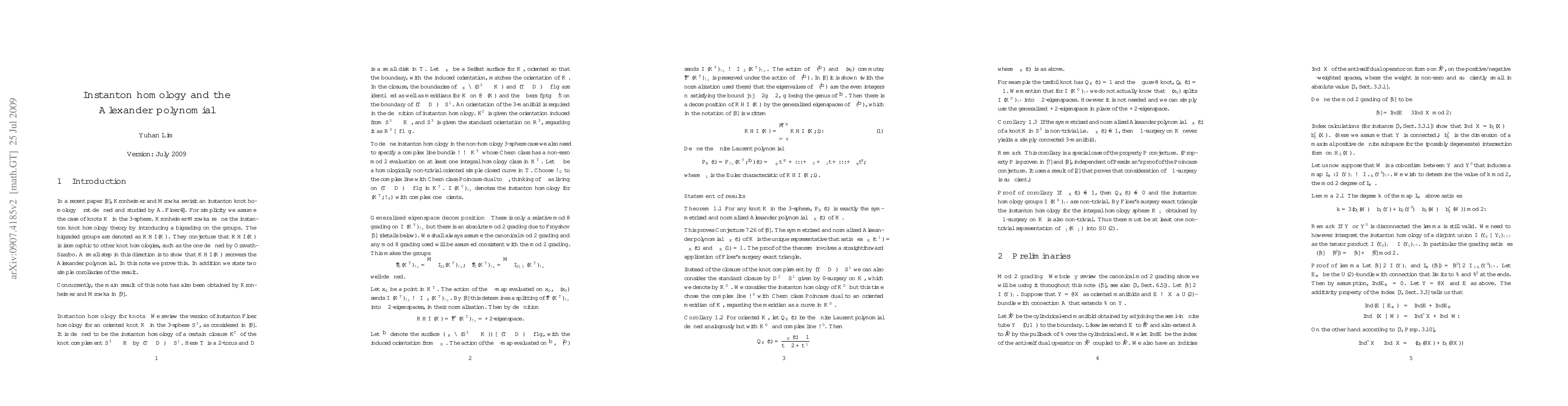 Summary: This paper demonstrates that the instanton knot homology KHI(K) aligns with the Alexander polynomial for knots in the 3-sphere, as defined by Kronheimer and Mrowka. The result establishes a significant connection between instanton homology and classical knot theory.