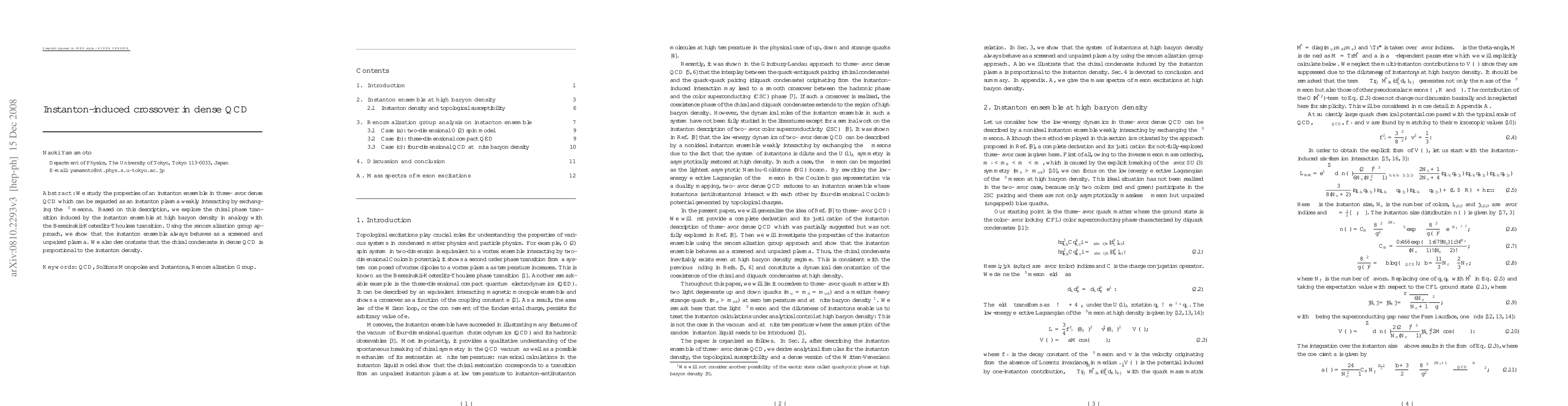 This study investigates the instanton ensemble in three-flavor dense QCD, revealing a chiral phase transition at high baryon density akin to the Berezinskii-Kosterlitz-Thouless transition. The instanton plasma is shown to be screened and unpaired, and the chiral condensate is found to be proportional to the instanton density.