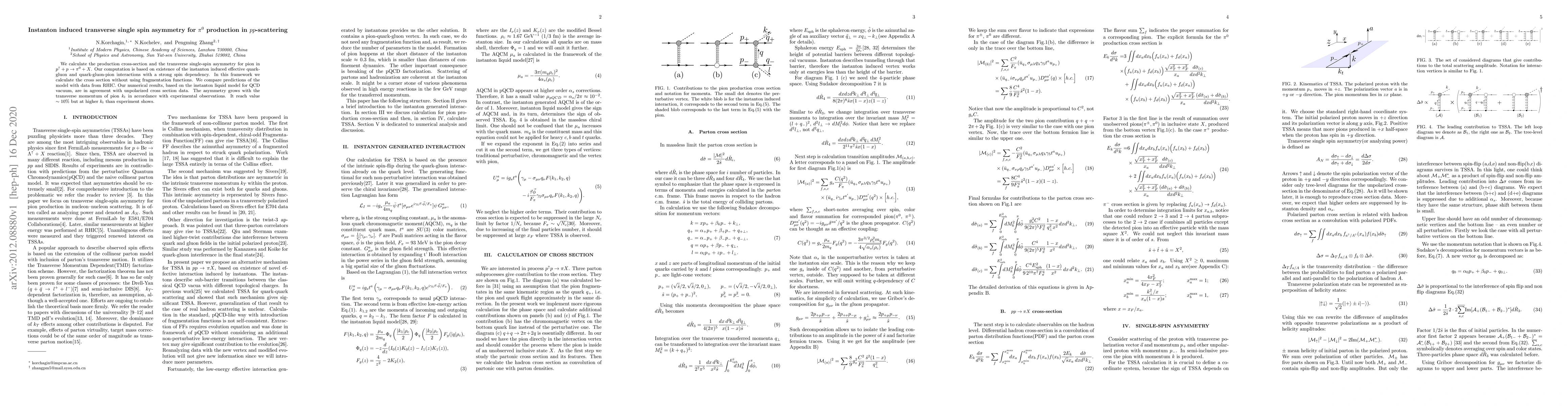 We calculate the production cross-section and the transverse single-spin asymmetry for pion in $p^{\uparrow}+p\to \pi^0 + X$. Our computation is based on existence of the instanton induced effective quark-gluon and quark-gluon-pion interactions with a strong spin dependency. In this framework we calculate the cross section without using fragmentation functions. We compare predictions of the model with data from RHIC. Our numerical results, based on the instanton liquid model for QCD vacuum, are in agreement with unpolarized cross section data. The asymmetry grows with the transverse momentum of pion $k_t$ in accordance with experimental observations. It reach value $\sim 10\%$ but at higher $k_t$ than experiment shows.