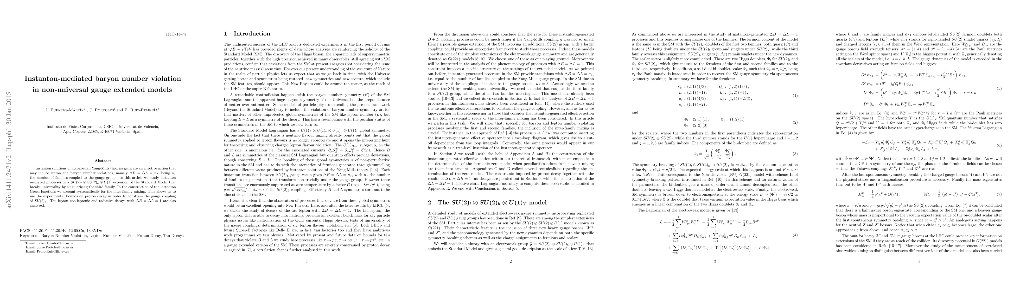 Instanton solutions of non-abelian Yang-Mills theories generate an effective action that may induce lepton and baryon number violations, namely $\Delta B = \Delta L = n_f$, being $n_f$ the number of families coupled to the gauge group. In this article we study instanton mediated processes in a $SU(2)_{\ell} \otimes SU(2)_h \otimes U(1)$ extension of the Standard Model that breaks universality by singularizing the third family. In the construction of the instanton Green functions we account systematically for the inter-family mixing. This allows us to use the experimental bounds on proton decay in order to constrain the gauge coupling of $SU(2)_h$. Tau lepton non-leptonic and radiative decays with $\Delta B = \Delta L = 1$ are also analysed.