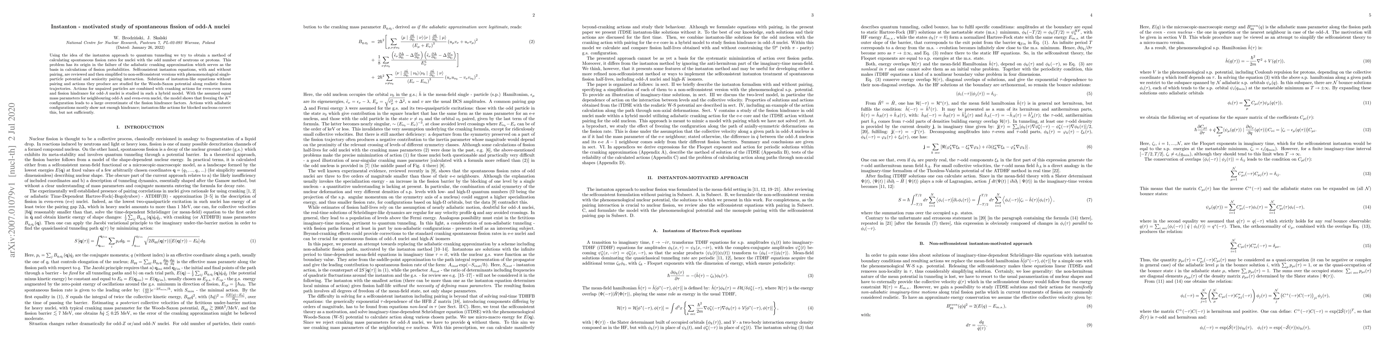 Using the idea of the instanton approach to quantum tunneling we try to obtain a method of calculating spontaneous fission rates for nuclei with the odd number of neutrons or protons. This problem has its origin in the failure of the adiabatic cranking approximation which serves as the basis in calculations of fission probabilities. Selfconsistent instanton equations, with and without pairing, are reviewed and then simplified to non-selfconsistent versions with phenomenological single-particle potential and seniority pairing interaction. Solutions of instanton-like equations without pairing and actions they produce are studied for the Woods-Saxon potential along realistic fission trajectories. Actions for unpaired particles are combined with cranking actions for even-even cores and fission hindrance for odd-A nuclei is studied in such a hybrid model. With the assumed equal mass parameters for neighbouring odd-A and even-even nuclei, the model shows that freezing the K {\pi} configuration leads to a large overestimate of the fission hindrance factors. Actions with adiabatic configurations mostly show not enough hindrance; instanton-like actions for blocked nucleons correct this, but not sufficiently.