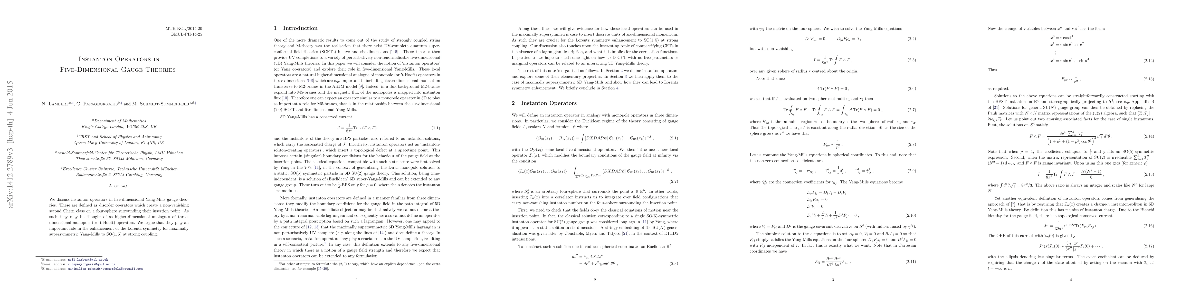 Instanton operators in five-dimensional gauge theories are higher-dimensional analogues of monopole operators, crucial for enhancing Lorentz symmetry to SO(1,5) at strong coupling. These operators create a non-vanishing second Chern class on a four-sphere around their insertion point.