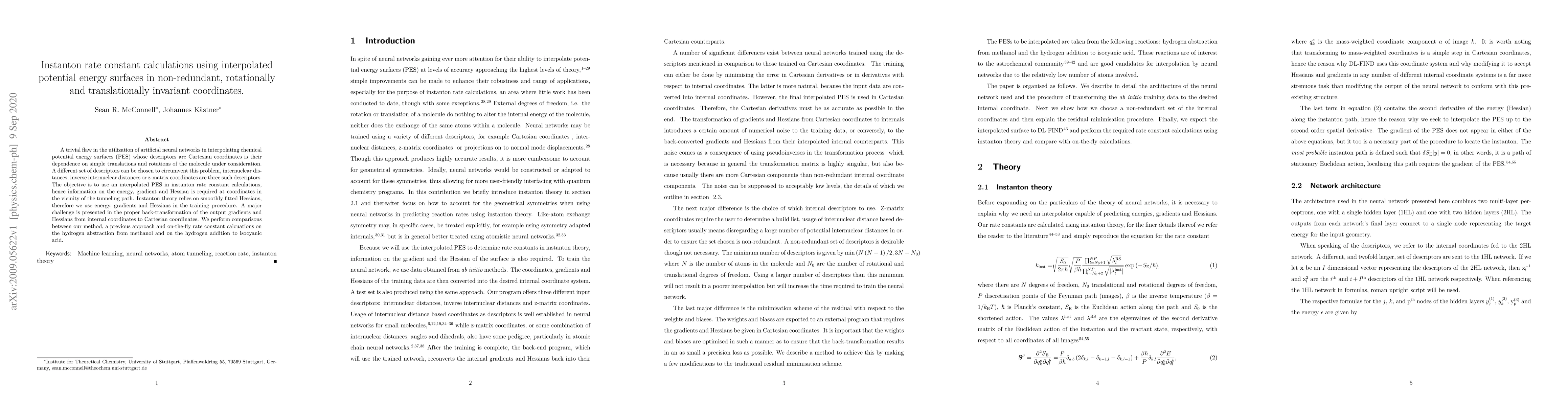 A trivial flaw in the utilization of artificial neural networks in interpolating chemical potential energy surfaces (PES) whose descriptors are Cartesian coordinates is their dependence on simple translations and rotations of the molecule under consideration. A different set of descriptors can be chosen to circumvent this problem, internuclear distances, inverse internuclear distances or z-matrix coordinates are three such descriptors. The objective is to use an interpolated PES in instanton rate constant calculations, hence information on the energy, gradient and Hessian is required at coordinates in the vicinity of the tunneling path. Instanton theory relies on smoothly fitted Hessians, therefore we use energy, gradients and Hessians in the training procedure. A major challenge is presented in the proper back-transformation of the output gradients and Hessians from internal coordinates to Cartesian coordinates. We perform comparisons between our method, a previous approach and on-the-fly rate constant calcuations on the hydrogen abstraction from methanol and on the hydrogen addition to isocyanic acid.