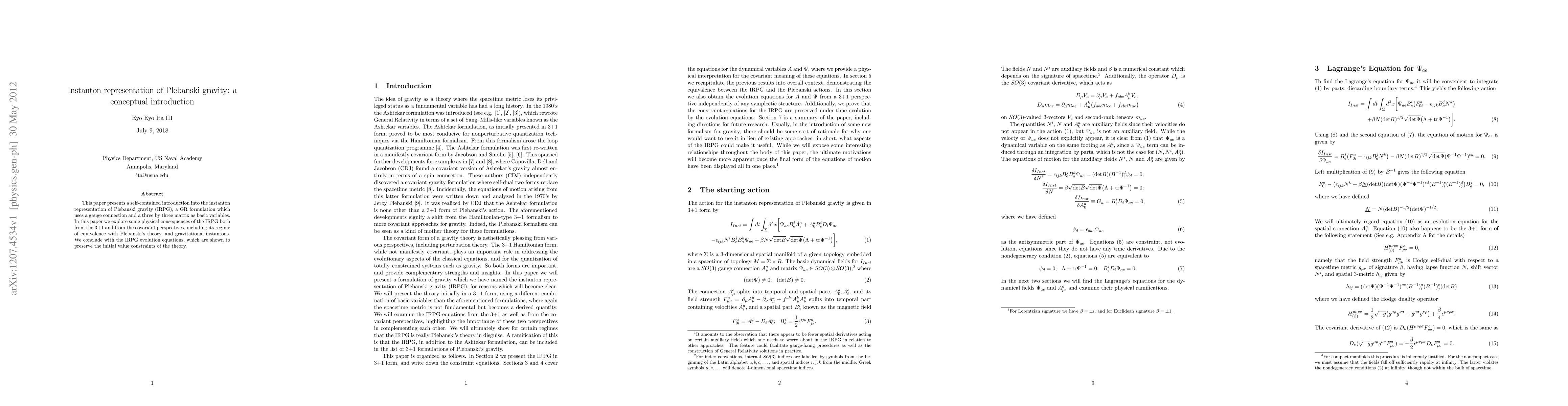 This paper introduces the instanton representation of Plebanski gravity (IRPG), using a gauge connection and a matrix as fundamental variables, and explores its physical implications and equivalence with Plebanski's theory, concluding with evolution equations that maintain initial value constraints.