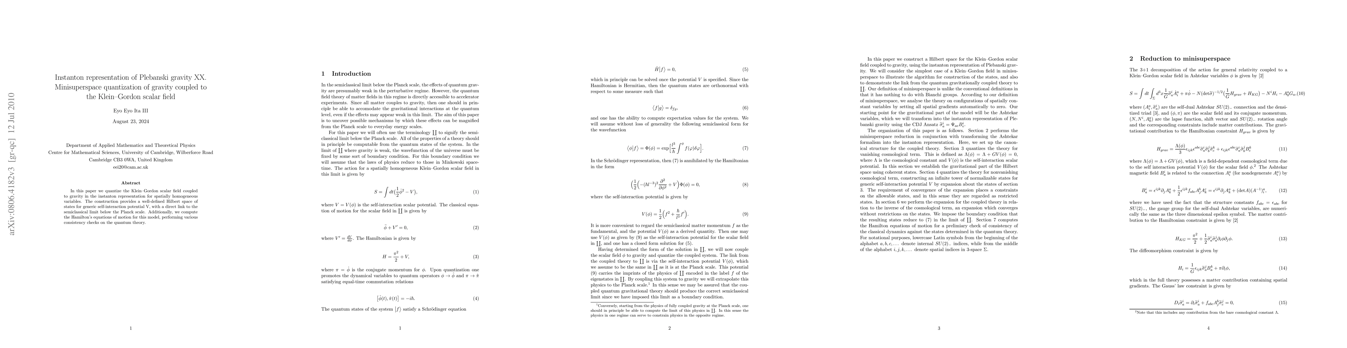 This paper quantizes gravity coupled to a Klein-Gordon scalar field using the instanton representation, providing a well-defined Hilbert space of states for generic self-interaction potentials.