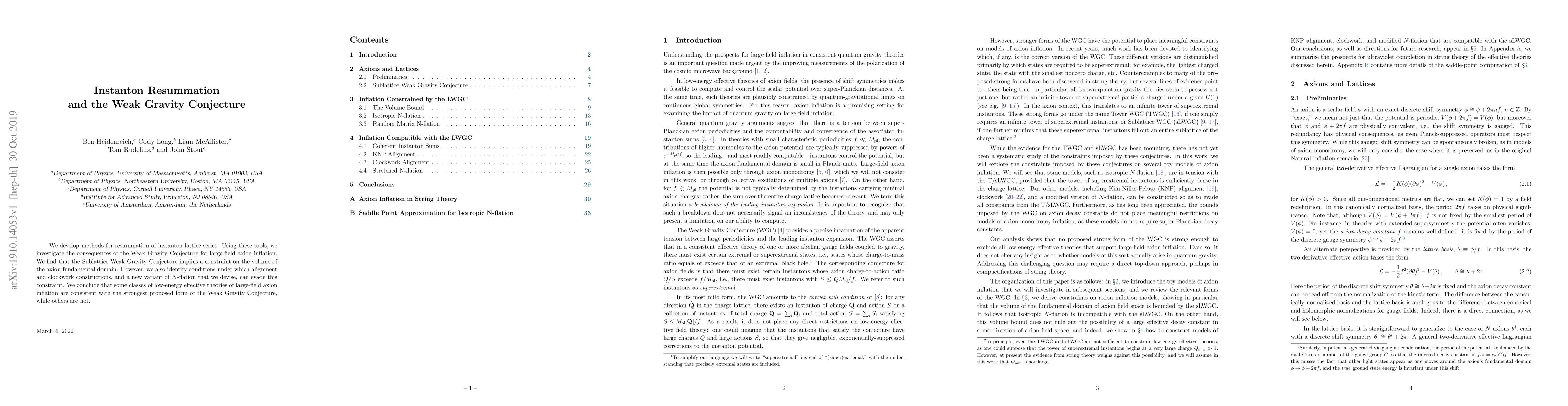 This paper develops techniques for instanton resummation and applies them to study the Weak Gravity Conjecture's implications for large-field axion inflation, finding that while some models are constrained, others, including new clockwork and N-flation variants, can evade these constraints.