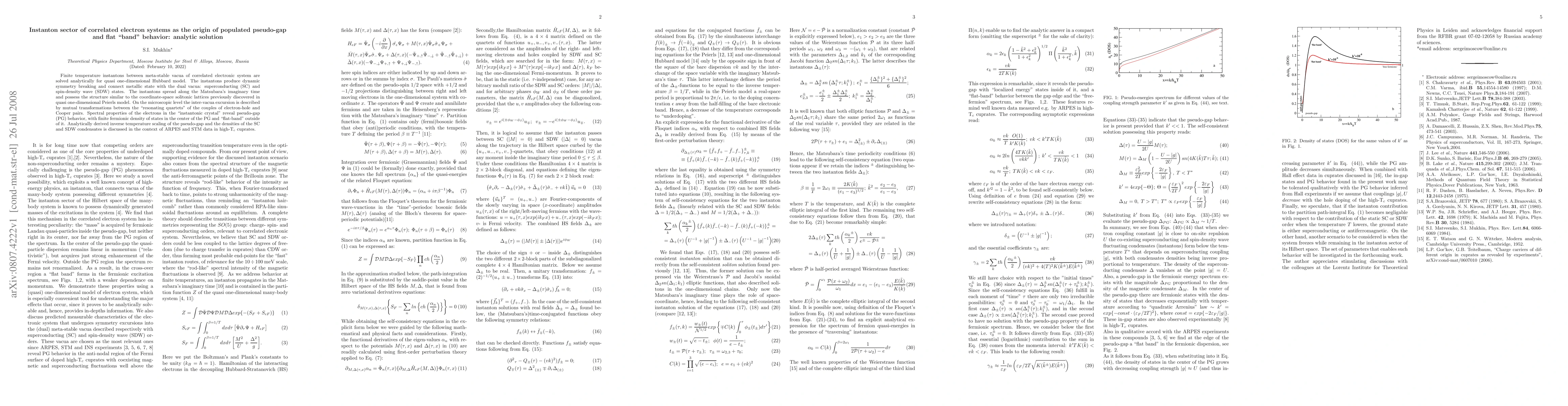 Finite temperature instantons between meta-stable vacua of correlated electronic system are solved analytically for quasi one-dimensional Hubbard model. The instantons produce dynamic symmetry breaking and connect metallic state with the dual vacua: superconducting (SC) and spin-density wave (SDW) states. The instantons spread along the Matsubara's imaginary time and possess the structure similar to the coordinate-space solitonic lattices previously discovered in quasi one-dimensional Peierls model. On the microscopic level the inter-vacua excursion is described by mutual transformations between the "resonating quartets" of the couples of electron-hole and Cooper pairs. Spectral properties of the electrons in the "instantonic crystal" reveal pseudo-gap (PG) behavior, with finite fermionic density of states in the center of the PG and ``flat-band'' outside of it. Analytically derived inverse temperature scaling of the pseudo-gap and the densities of the SC and SDW condensates is discussed in the context of ARPES and STM data in high-Tc cuprates.