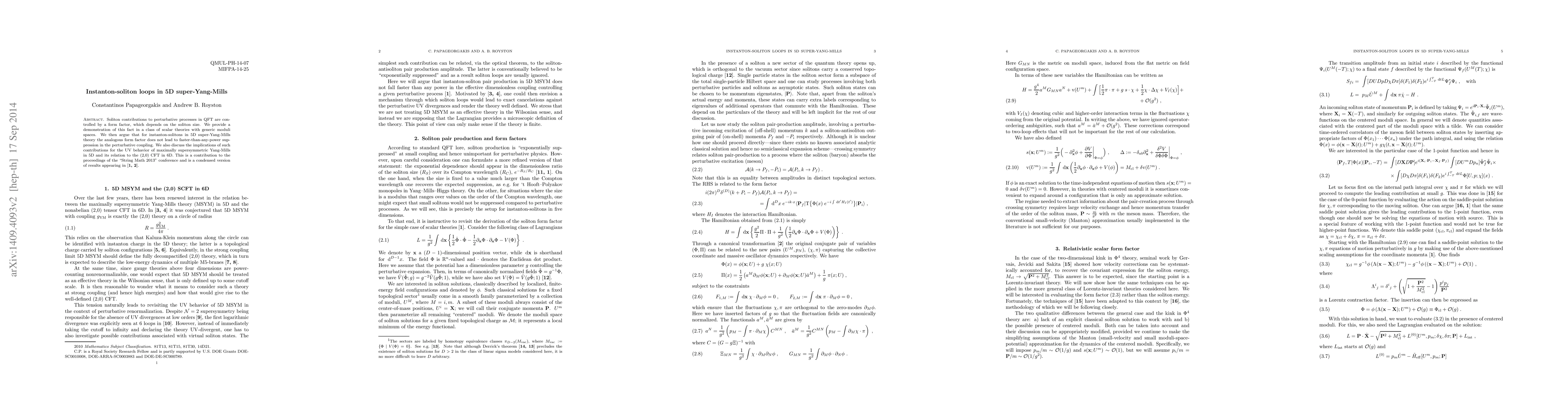 Soliton contributions to perturbative processes in QFT are controlled by a form factor, which depends on the soliton size. We provide a demonstration of this fact in a class of scalar theories with generic moduli spaces. We then argue that for instanton-solitons in 5D super-Yang-Mills theory the analogous form factor does not lead to faster-than-any-power suppression in the perturbative coupling. We also discuss the implications of such contributions for the UV behavior of maximally supersymmetric Yang-Mills in 5D and its relation to the (2,0) CFT in 6D. This is a contribution to the proceedings of the "String Math 2013'" conference and is a condensed version of results appearing in 1404.0016 and 1403.5017.