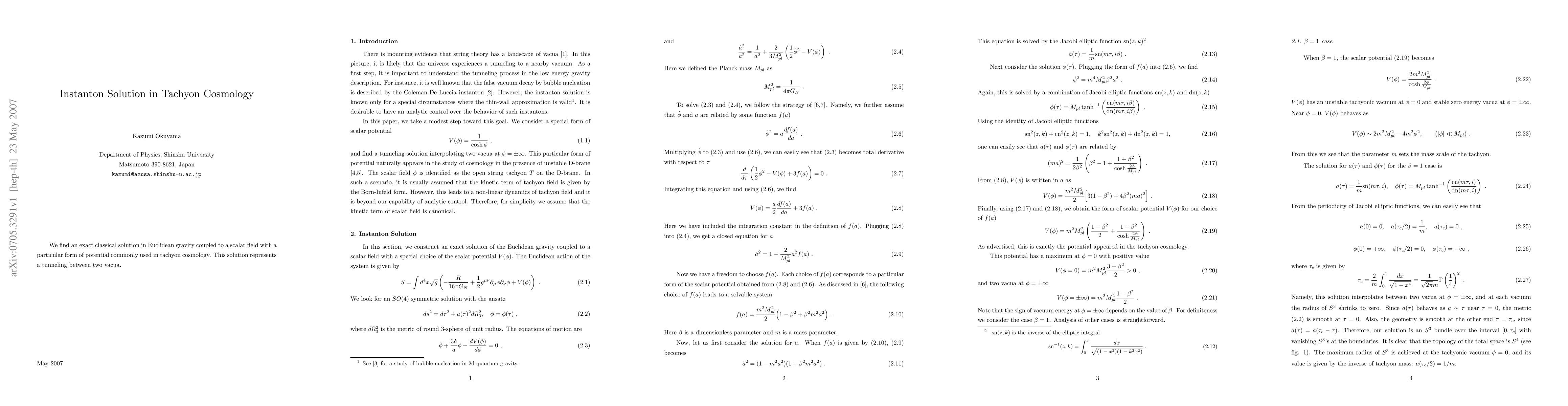 We find an exact classical solution in Euclidean gravity coupled to a scalar field with a particular form of potential commonly used in tachyon cosmology. This solution represents a tunneling between two vacua.