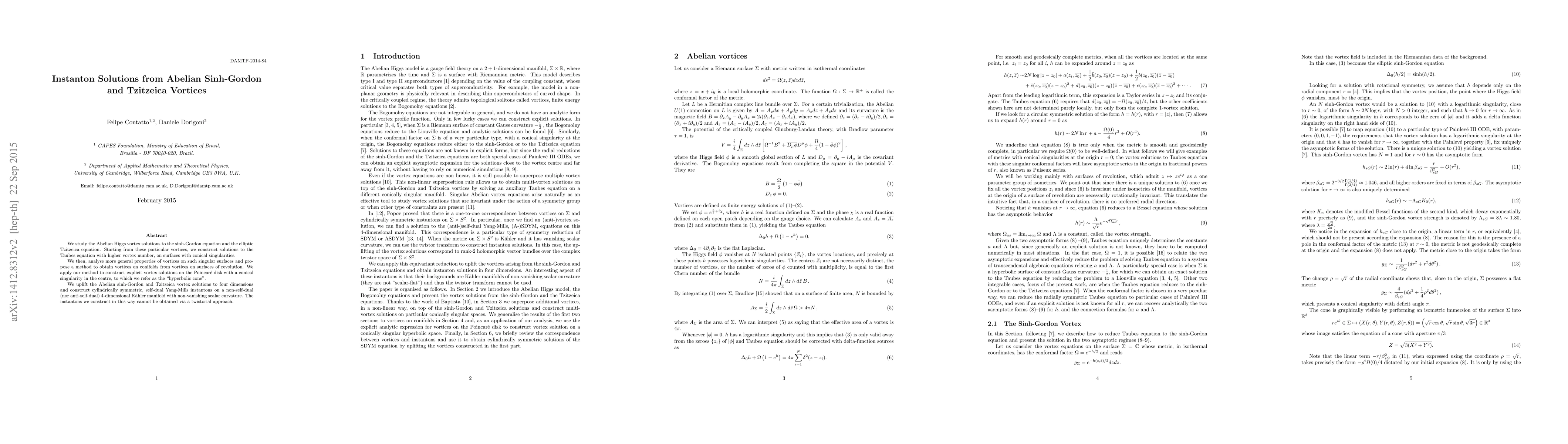 This research explores Abelian Higgs vortex solutions to the sinh-Gordon and Tzitzeica equations, constructs higher vortex solutions on surfaces with conical singularities, and develops a method to uplift these solutions to four dimensions. The study culminates in the creation of cylindrically symmetric, self-dual Yang-Mills instantons on a non-self-dual Kähler manifold.