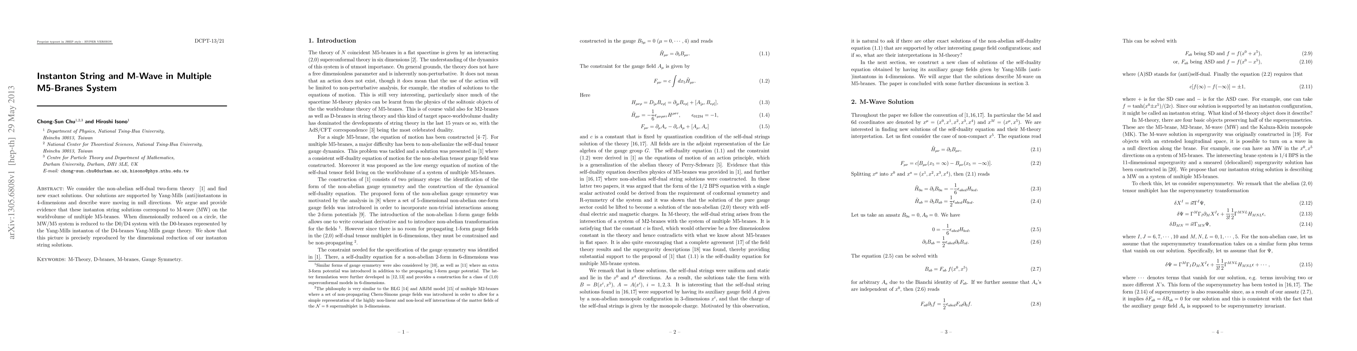 We consider the non-abelian self-dual two-form theory arXiv:1203.4224 and find new exact solutions. Our solutions are supported by Yang-Mills (anti)instantons in 4-dimensions and describe wave moving in null directions. We argue and provide evidence that these instanton string solutions correspond to M-wave (MW) on the worldvolume of multiple M5-branes. When dimensionally reduced on a circle, the MW/M5 system is reduced to the D0/D4 system with the D0-branes represented by the Yang-Mills instanton of the D4-branes Yang-Mills gauge theory. We show that this picture is precisely reproduced by the dimensional reduction of our instanton string solutions.