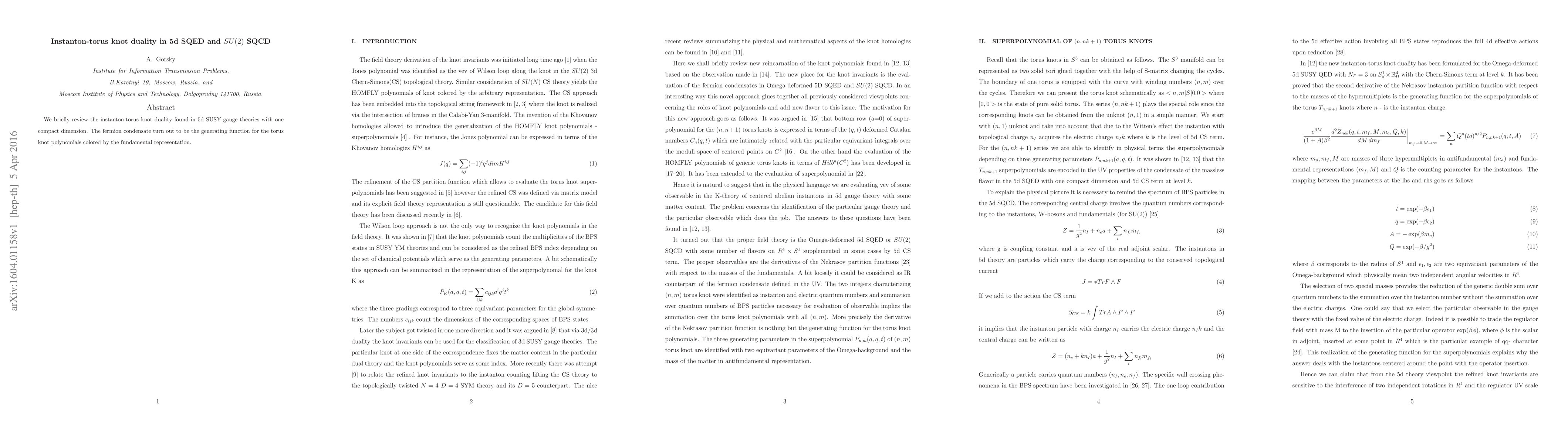 We briefly review the instanton-torus knot duality found in 5d SUSY gauge theories with one compact dimension. The fermion condensate turn out to be the generating function for the torus knot polynomials colored by the fundamental representation.