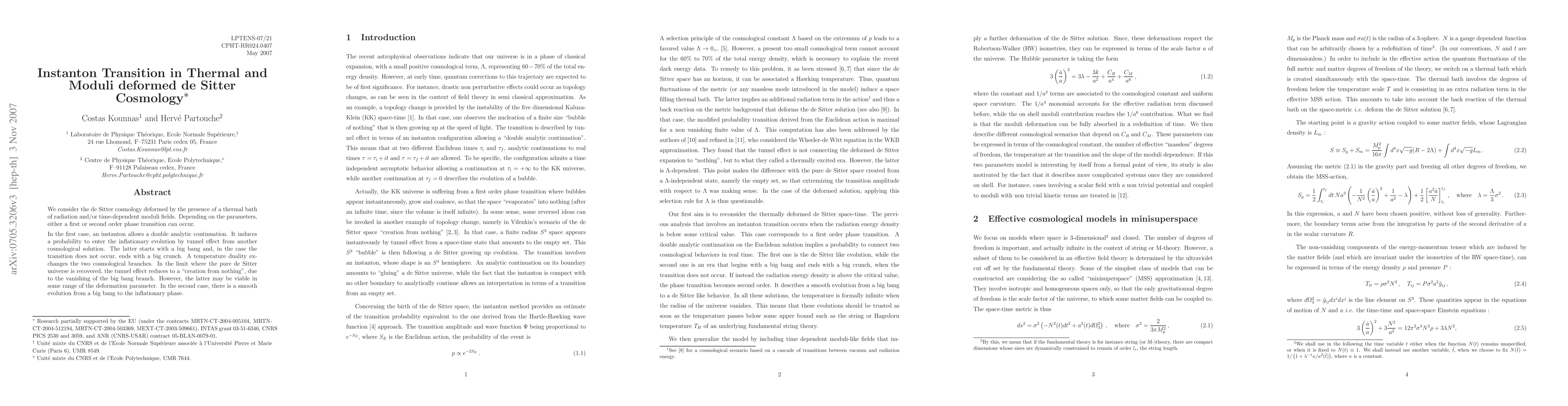 We consider the de Sitter cosmology deformed by the presence of a thermal bath of radiation and/or time-dependent moduli fields. Depending on the parameters, either a first or second order phase transition can occur. In the first case, an instanton allows a double analytic continuation. It induces a probability to enter the inflationary evolution by tunnel effect from another cosmological solution. The latter starts with a big bang and, in the case the transition does not occur, ends with a big crunch. A temperature duality exchanges the two cosmological branches. In the limit where the pure de Sitter universe is recovered, the tunnel effect reduces to a "creation from nothing", due to the vanishing of the big bang branch. However, the latter may be viable in some range of the deformation parameter. In the second case, there is a smooth evolution from a big bang to the inflationary phase.