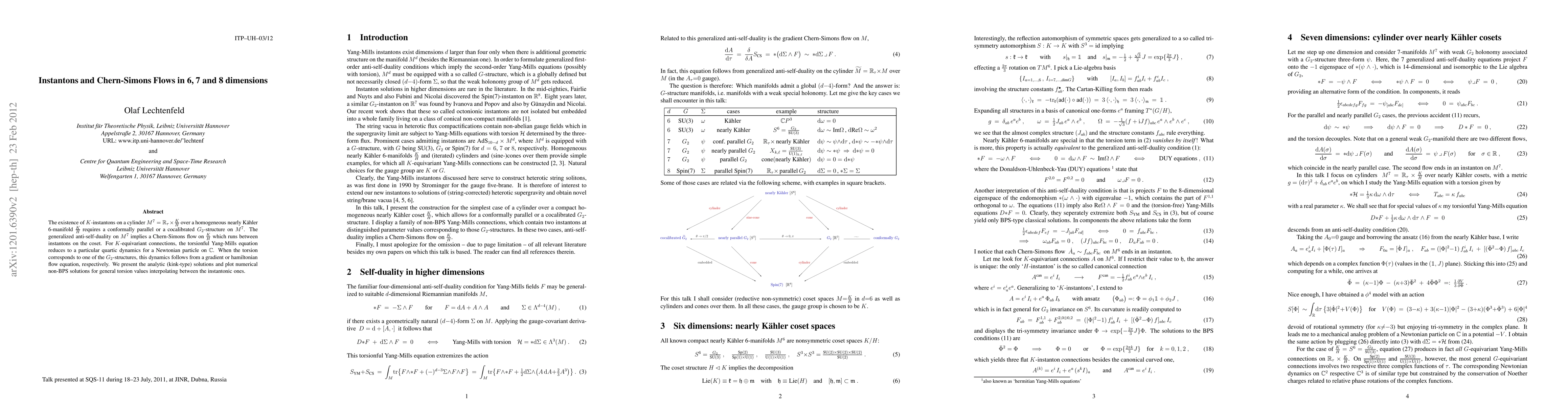 The existence of K-instantons on a cylinder M^7 = R_tau x K/H over a homogeneous nearly K"ahler 6-manifold K/H requires a conformally parallel or a cocalibrated G_2-structure on M^7. The generalized anti-self-duality on M^7 implies a Chern-Simons flow on K/H which runs between instantons on the coset. For K-equivariant connections, the torsionful Yang-Mills equation reduces to a particular quartic dynamics for a Newtonian particle on C. When the torsion corresponds to one of the G_2-structures, this dynamics follows from a gradient or hamiltonian flow equation, respectively. We present the analytic (kink-type) solutions and plot numerical non-BPS solutions for general torsion values interpolating between the instantonic ones.