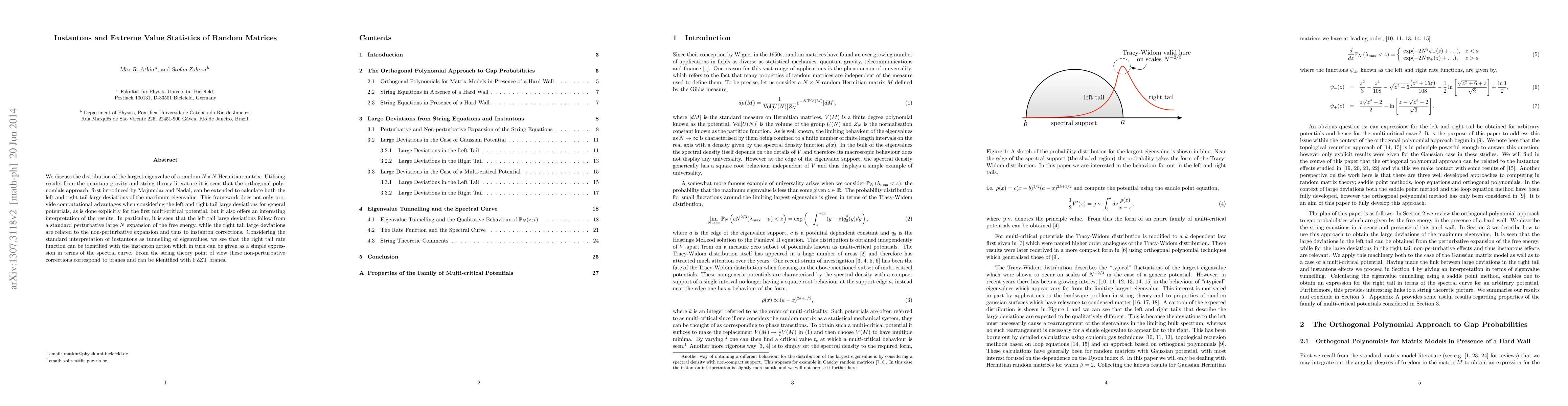 We discuss the distribution of the largest eigenvalue of a random N x N Hermitian matrix. Utilising results from the quantum gravity and string theory literature it is seen that the orthogonal polynomials approach, first introduced by Majumdar and Nadal, can be extended to calculate both the left and right tail large deviations of the maximum eigenvalue. This framework does not only provide computational advantages when considering the left and right tail large deviations for general potentials, as is done explicitly for the first multi-critical potential, but it also offers an interesting interpretation of the results. In particular, it is seen that the left tail large deviations follow from a standard perturbative large N expansion of the free energy, while the right tail large deviations are related to the non-perturbative expansion and thus to instanton corrections. Considering the standard interpretation of instantons as tunnelling of eigenvalues, we see that the right tail rate function can be identified with the instanton action which in turn can be given as a simple expression in terms of the spectral curve. From the string theory point of view these non-perturbative corrections correspond to branes and can be identified with FZZT branes.