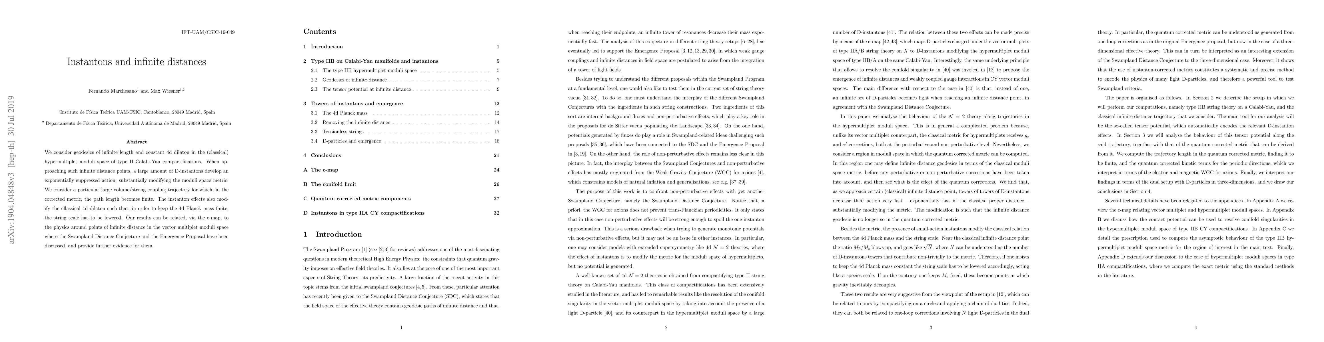 We consider geodesics of infinite length and constant 4d dilaton in the (classical) hypermultiplet moduli space of type II Calabi-Yau compactifications. When approaching such infinite distance points, a large amount of D-instantons develop an exponentially suppressed action, substantially modifying the moduli space metric. We consider a particular large volume/strong coupling trajectory for which, in the corrected metric, the path length becomes finite. The instanton effects also modify the cllassical 4d dilaton such that, in order to keep the 4d Planck mass finite, the string scale has to be lowered. Our results can be related, via the c-map, to the physics around points of infinite distance in the vector multiplet moduli space where the Swampland Distance Conjecture and the Emergence Proposal have been discussed, and provide further evidence for them.