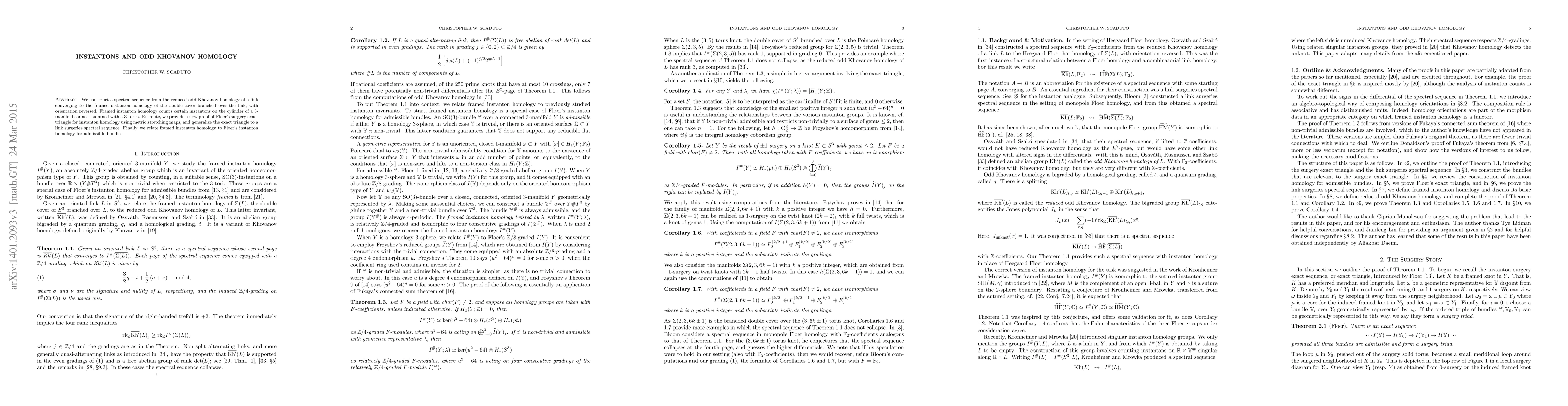 The paper constructs a spectral sequence from the reduced odd Khovanov homology of a link, converging to the framed instanton homology of the double cover branched over the link, with orientation reversed. It provides a new proof of Floer's surgery exact triangle for instanton homology using metric stretching maps and generalizes the exact triangle to a link surgeries spectral sequence.
