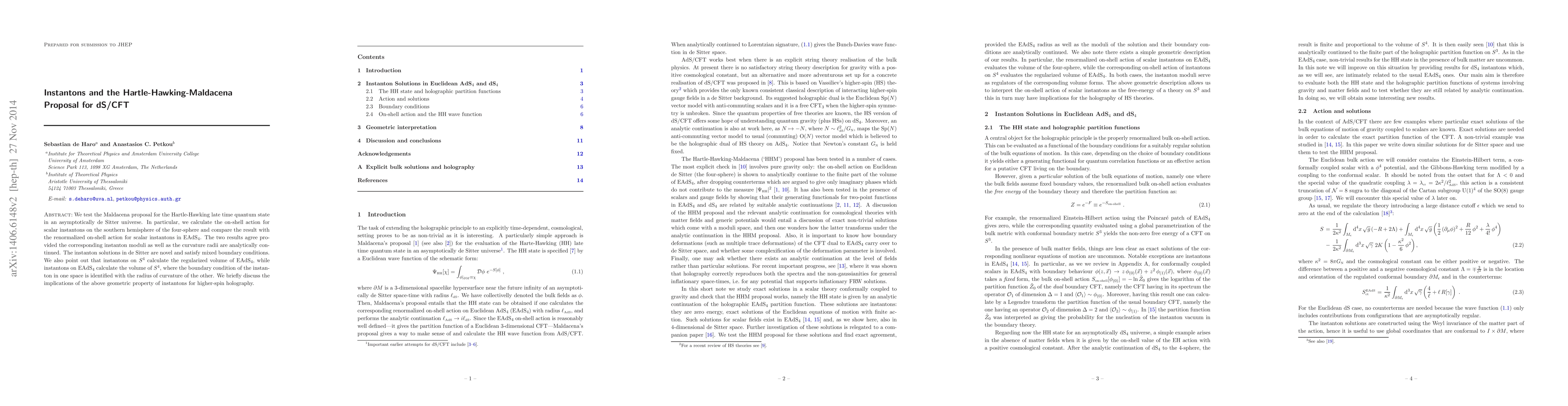 We test the Maldacena proposal for the Hartle-Hawking late time quantum state in an asymptotically de Sitter universe. In particular, we calculate the on-shell action for scalar instantons on the southern hemisphere of the four-sphere and compare the result with the renormalized on-shell action for scalar instantons in EAdS$_4$. The two results agree provided the corresponding instanton moduli as well as the curvature radii are analytically continued. The instanton solutions in de Sitter are novel and satisfy mixed boundary conditions. We also point out that instantons on $S^4$ calculate the regularized volume of EAdS$_4$, while instantons on EAdS$_4$ calculate the volume of $S^4$, where the boundary condition of the instanton in one space is identified with the radius of curvature of the other. We briefly discuss the implications of the above geometric property of instantons for higher-spin holography.