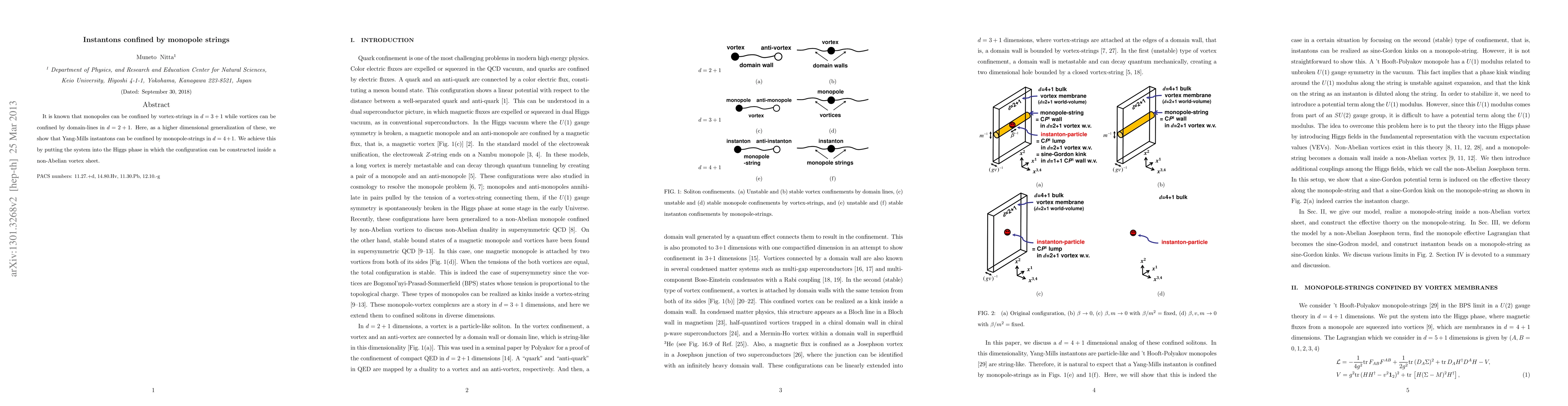 This paper explores how Yang-Mills instantons can be confined by monopole strings in a higher-dimensional space (d=4+1), extending the concept of confinement seen in lower dimensions. The authors achieve this by transitioning the system into the Higgs phase within a non-Abelian vortex sheet.