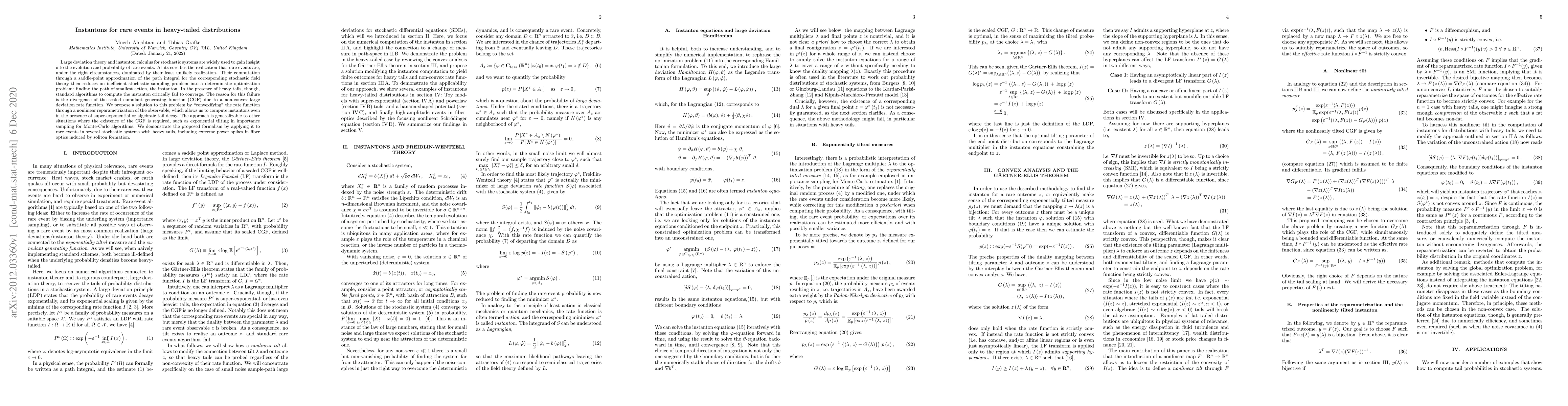 Large deviation theory and instanton calculus for stochastic systems are widely used to gain insight into the evolution and probability of rare events. At its core lies the realization that rare events are, under the right circumstances, dominated by their least unlikely realization. Their computation through a saddle-point approximation of the path integral for the corresponding stochastic field theory then reduces an inefficient stochastic sampling problem into a deterministic optimization problem: finding the path of smallest action, the instanton. In the presence of heavy tails, though, standard algorithms to compute the instanton critically fail to converge. The reason for this failure is the divergence of the scaled cumulant generating function (CGF) due to a non-convex large deviation rate function. We propose a solution to this problem by "convexifying" the rate function through nonlinear reparametrization of the observable, which allows us to compute instantons even in the presence of super-exponential or algebraic tail decay. The approach is generalizable to other situations where the existence of the CGF is required, such as exponential tilting in importance sampling for Monte-Carlo algorithms. We demonstrate the proposed formalism by applying it to rare events in several stochastic systems with heavy tails, including extreme power spikes in fiber optics induced by soliton formation.