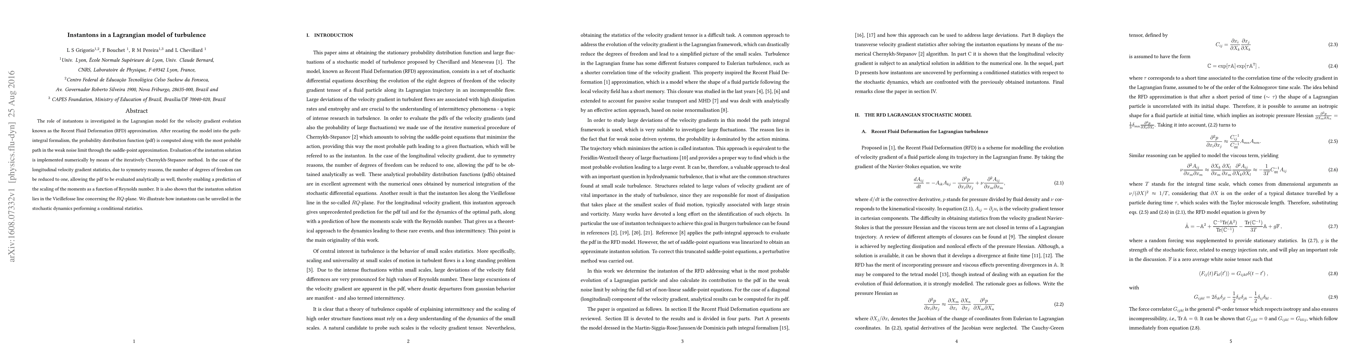 The role of instantons is investigated in the Lagrangian model for the velocity gradient evolution known as the Recent Fluid Deformation approximation. After recasting the model into the path-integral formalism, the probability distribution function is computed along with the most probable path in the weak noise limit through the saddle-point approximation. Evaluation of the instanton solution is implemented numerically by means of the iteratively Chernykh-Stepanov method. In the case of the longitudinal velocity gradient statistics, due to symmetry reasons, the number of degrees of freedom can be reduced to one, allowing the pdf to be evaluated analytically as well, thereby enabling a prediction of the scaling of the moments as a function of Reynolds number. It is also shown that the instanton solution lies on the Vieillefosse line concerning the RQ-plane. We illustrate how instantons can be unveiled in the stochastic dynamics performing a conditional statistics.