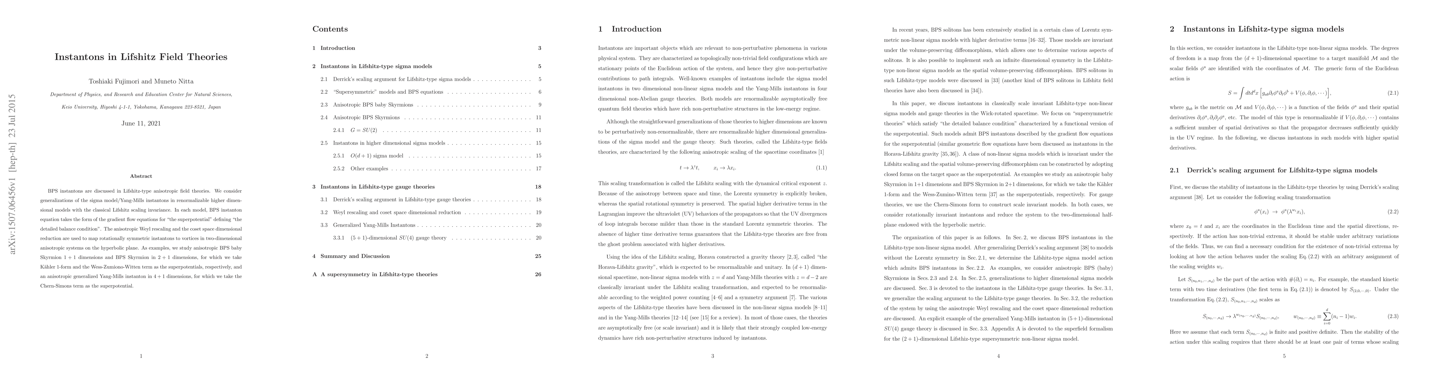 This paper explores BPS instantons in Lifshitz field theories, focusing on their generalizations in higher-dimensional renormalizable models. It examines instanton equations as gradient flow equations for superpotentials, mapping rotationally symmetric instantons to vortices in anisotropic systems.