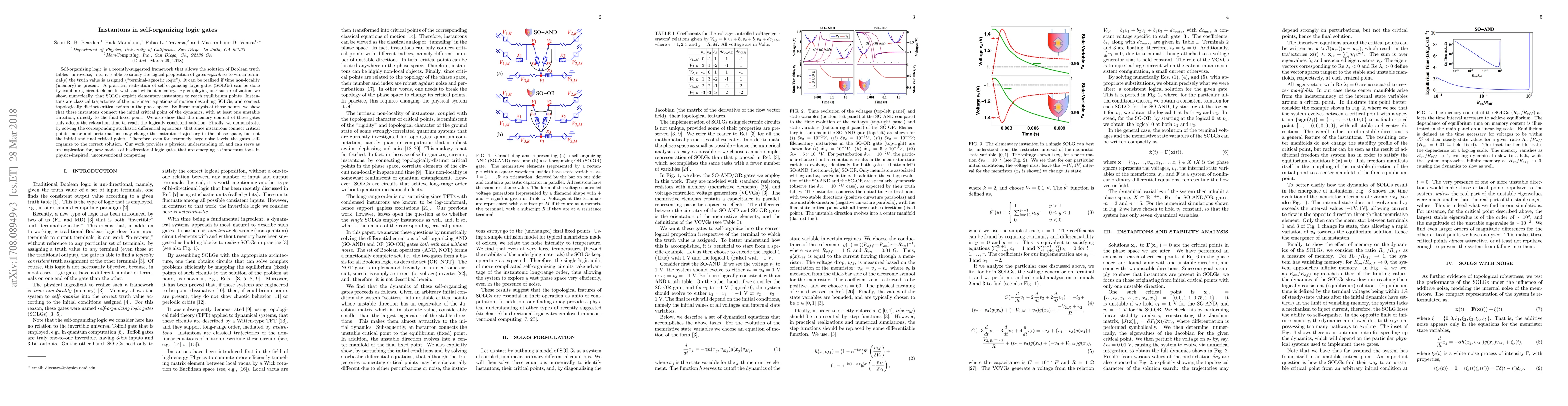 This paper investigates self-organizing logic gates (SOLGs) that solve Boolean truth tables in a terminal-agnostic manner, revealing that they utilize elementary instantons to reach equilibrium. Instantons connect critical points in the phase space, ensuring the gates self-organize to the correct solution despite noise and perturbations.