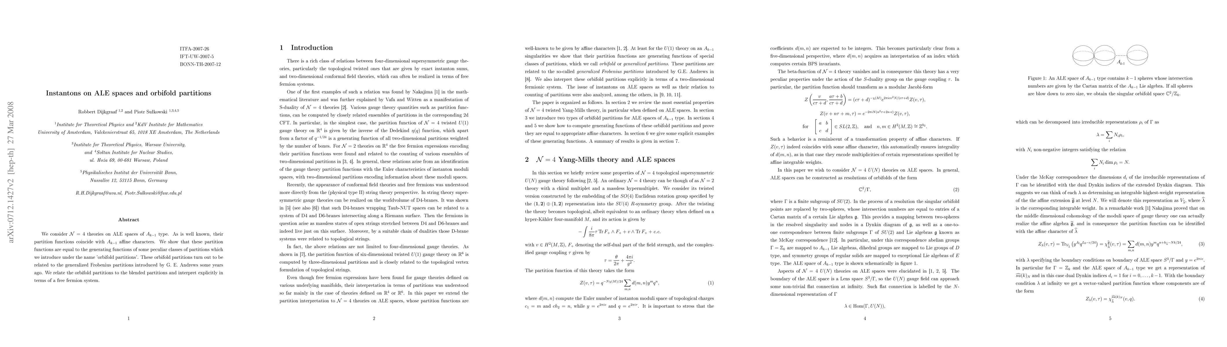 We consider N=4 theories on ALE spaces of $A_{k-1}$ type. As is well known, their partition functions coincide with $A_{k-1}$ affine characters. We show that these partition functions are equal to the generating functions of some peculiar classes of partitions which we introduce under the name 'orbifold partitions'. These orbifold partitions turn out to be related to the generalized Frobenius partitions introduced by G. E. Andrews some years ago. We relate the orbifold partitions to the blended partitions and interpret explicitly in terms of a free fermion system.