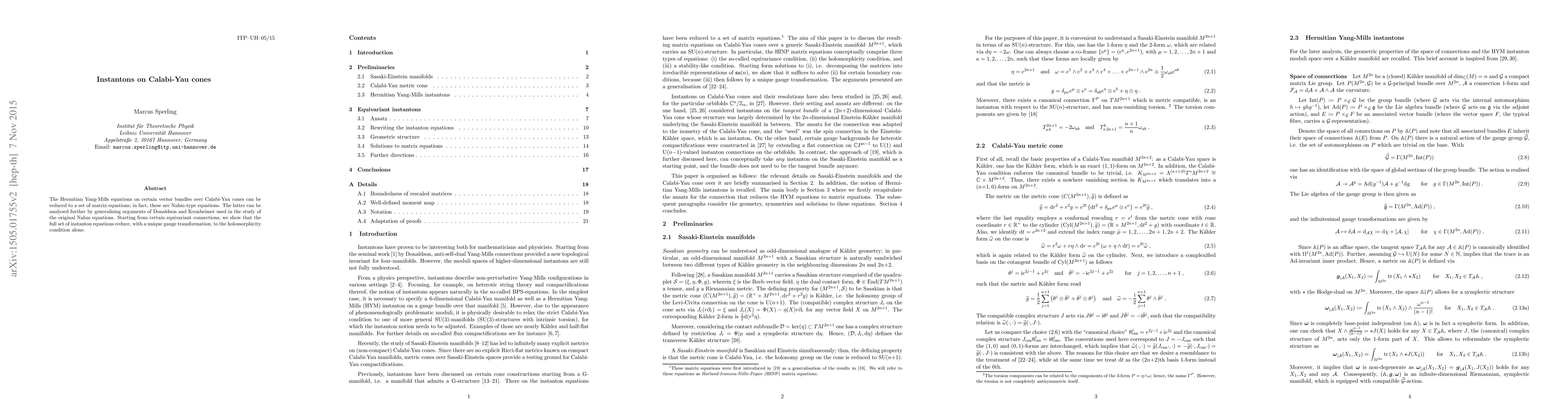 The Hermitian Yang-Mills equations on certain vector bundles over Calabi-Yau cones can be reduced to a set of matrix equations; in fact, these are Nahm-type equations. The latter can be analysed further by generalising arguments of Donaldson and Kronheimer used in the study of the original Nahm equations. Starting from certain equivariant connections, we show that the full set of instanton equations reduce, with a unique gauge transformation, to the holomorphicity condition alone.