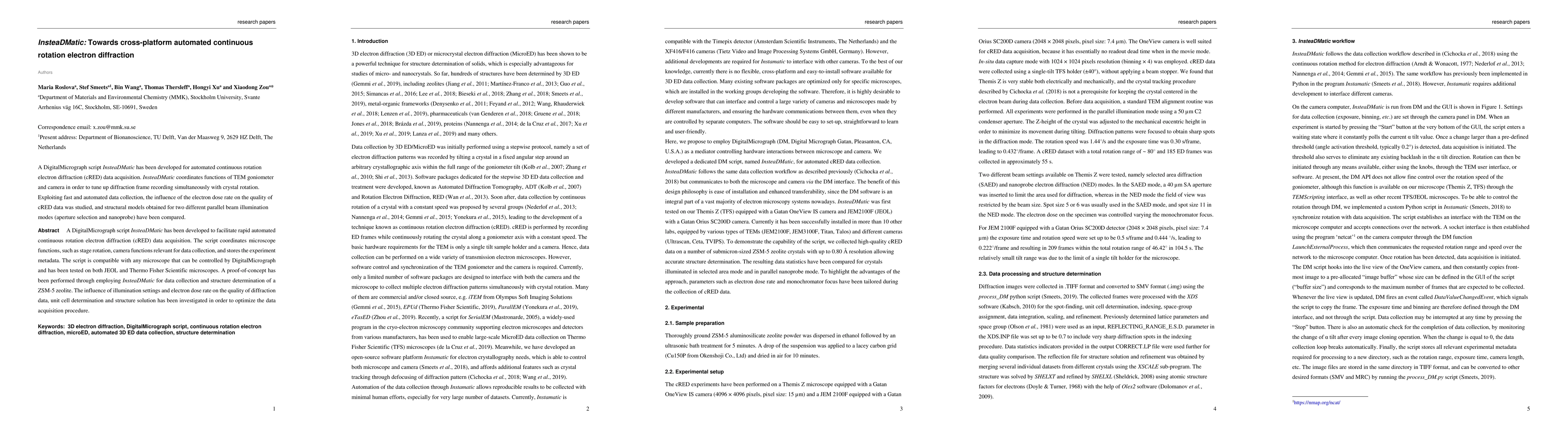 A DigitalMicrograph script InsteaDMatic has been developed to facilitate rapid automated continuous rotation electron diffraction (cRED) data acquisition. The script coordinates microscope functions, such as stage rotation, camera functions relevant for data collection, and stores the experiment metadata. The script is compatible with any microscope that can be controlled by DigitalMicrograph and has been tested on both JEOL and Thermo Fisher Scientific microscopes. A proof-of-concept has been performed through employing InsteaDMatic for data collection and structure determination of a ZSM-5 zeolite. The influence of illumination settings and electron dose rate on the quality of diffraction data, unit cell determination and structure solution has been investigated in order to optimize the data acquisition procedure.