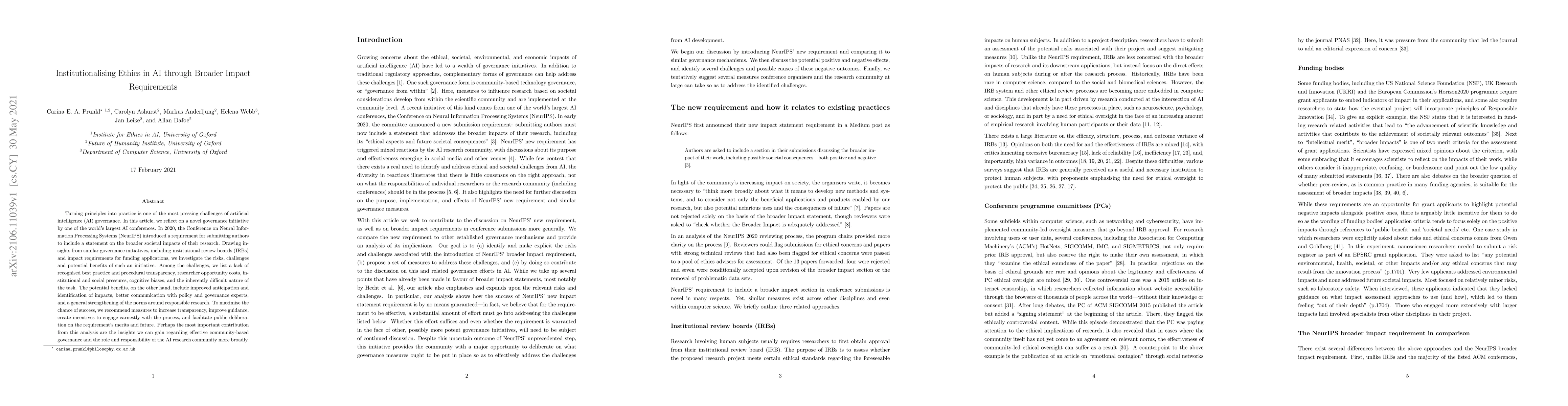 This paper examines the introduction of broader impact requirements at the NeurIPS conference to institutionalize ethics in AI, analyzing associated risks, challenges, and benefits. It recommends enhancing transparency, guidance, and public deliberation to improve the initiative's success and effectiveness in fostering responsible AI research.