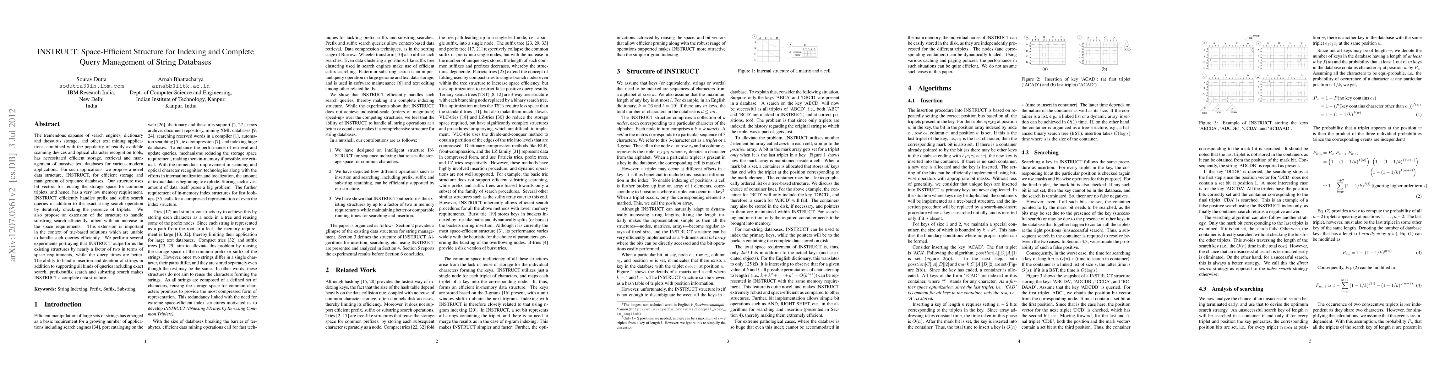 The tremendous expanse of search engines, dictionary and thesaurus storage, and other text mining applications, combined with the popularity of readily available scanning devices and optical character recognition tools, has necessitated efficient storage, retrieval and management of massive text databases for various modern applications. For such applications, we propose a novel data structure, INSTRUCT, for efficient storage and management of sequence databases. Our structure uses bit vectors for reusing the storage space for common triplets, and hence, has a very low memory requirement. INSTRUCT efficiently handles prefix and suffix search queries in addition to the exact string search operation by iteratively checking the presence of triplets. We also propose an extension of the structure to handle substring search efficiently, albeit with an increase in the space requirements. This extension is important in the context of trie-based solutions which are unable to handle such queries efficiently. We perform several experiments portraying that INSTRUCT outperforms the existing structures by nearly a factor of two in terms of space requirements, while the query times are better. The ability to handle insertion and deletion of strings in addition to supporting all kinds of queries including exact search, prefix/suffix search and substring search makes INSTRUCT a complete data structure.