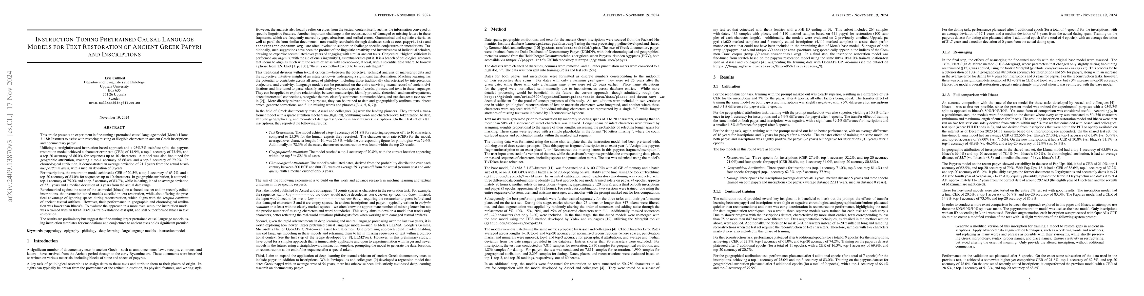 This research fine-tunes a pretrained causal language model for ancient Greek philology, improving text restoration, geographic, and chronological attribution in inscriptions and papyri, achieving better accuracy and error rates compared to existing methods.