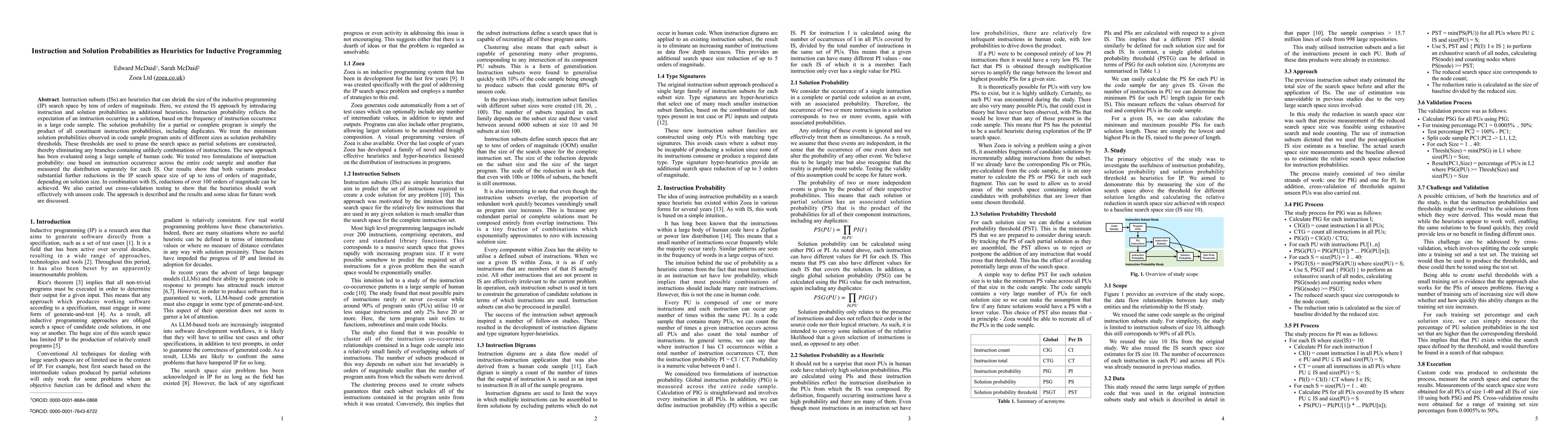 Instruction subsets (ISs) are heuristics that can shrink the size of the inductive programming (IP) search space by tens of orders of magnitude. Here, we extend the IS approach by introducing instruction and solution probabilities as additional heuristics. Instruction probability reflects the expectation of an instruction occurring in a solution, based on the frequency of instruction occurrence in a large code sample. The solution probability for a partial or complete program is simply the product of all constituent instruction probabilities, including duplicates. We treat the minimum solution probabilities observed in code sample program units of different sizes as solution probability thresholds. These thresholds are used to prune the search space as partial solutions are constructed, thereby eliminating any branches containing unlikely combinations of instructions. The new approach has been evaluated using a large sample of human code. We tested two formulations of instruction probability: one based on instruction occurrence across the entire code sample and another that measured the distribution separately for each IS. Our results show that both variants produce substantial further reductions in the IP search space size of up to tens of orders of magnitude, depending on solution size. In combination with IS, reductions of over 100 orders of magnitude can be achieved. We also carried out cross-validation testing to show that the heuristics should work effectively with unseen code. The approach is described and the results and some ideas for future work are discussed.