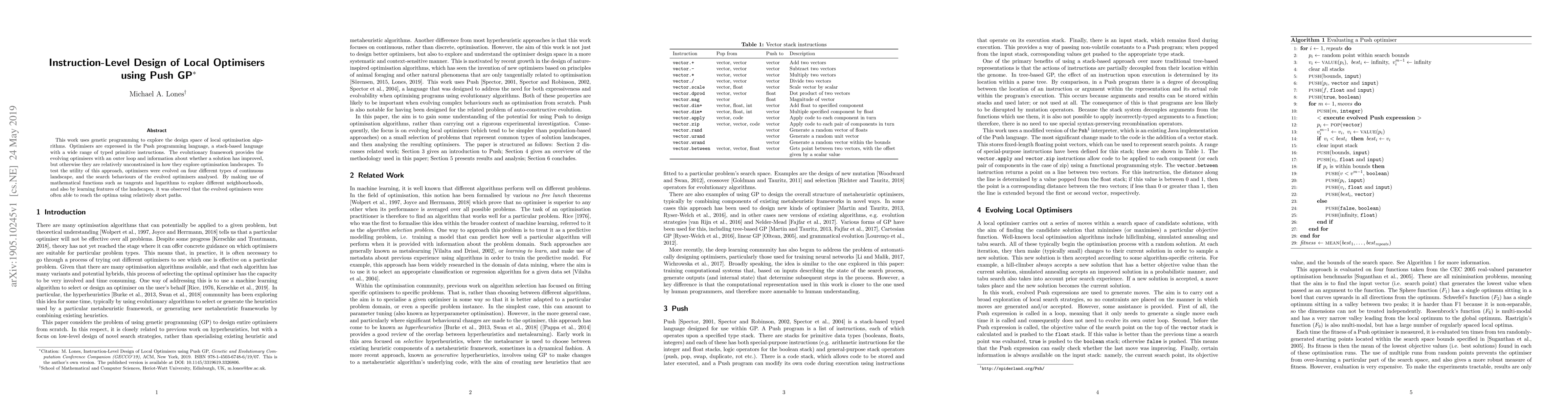 This work uses genetic programming to explore the design space of local optimisation algorithms. Optimisers are expressed in the Push programming language, a stack-based language with a wide range of typed primitive instructions. The evolutionary framework provides the evolving optimisers with an outer loop and information about whether a solution has improved, but otherwise they are relatively unconstrained in how they explore optimisation landscapes. To test the utility of this approach, optimisers were evolved on four different types of continuous landscape, and the search behaviours of the evolved optimisers analysed. By making use of mathematical functions such as tangents and logarithms to explore different neighbourhoods, and also by learning features of the landscapes, it was observed that the evolved optimisers were often able to reach the optima using relatively short paths.