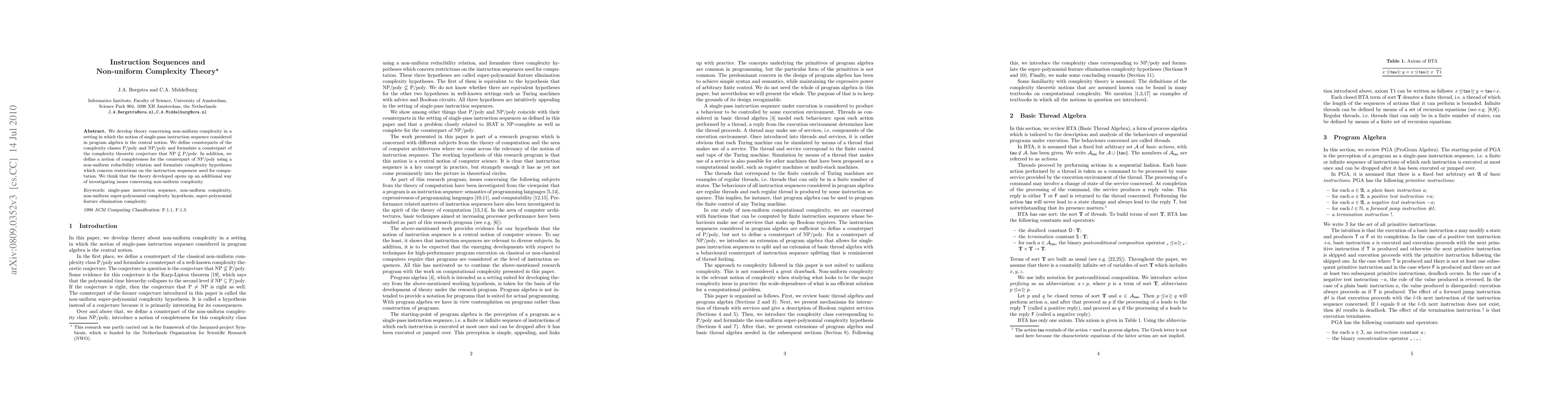 This theory provides an additional avenue for investigating non-uniform complexity issues, bridging program algebra with complexity theory by focusing on single-pass instruction sequences.